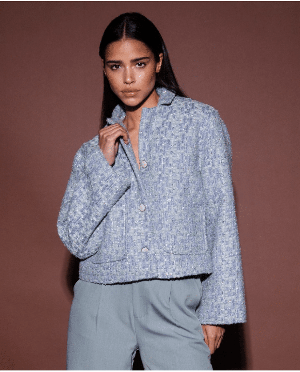 Poppy Jacket - Damesjasje van AMAYA Amsterdam met bouclé structuur, subtiele glansdraad, opgestikte zakken, kraag en knoopsluiting