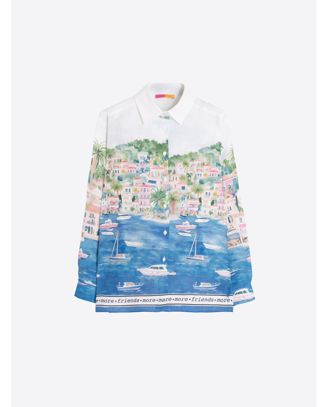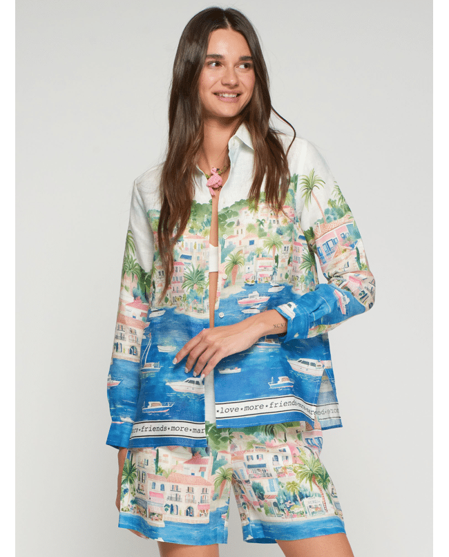 Deze Puerto Banús blouse van Vilagallo voelt als een zomerse wandeling langs de kust. De kleurrijke print met palmbomen, huizen en bootjes brengt direct een ontspannen, vakantieachtige sfeer. Een statement blouse die toch makkelijk draagt.