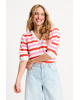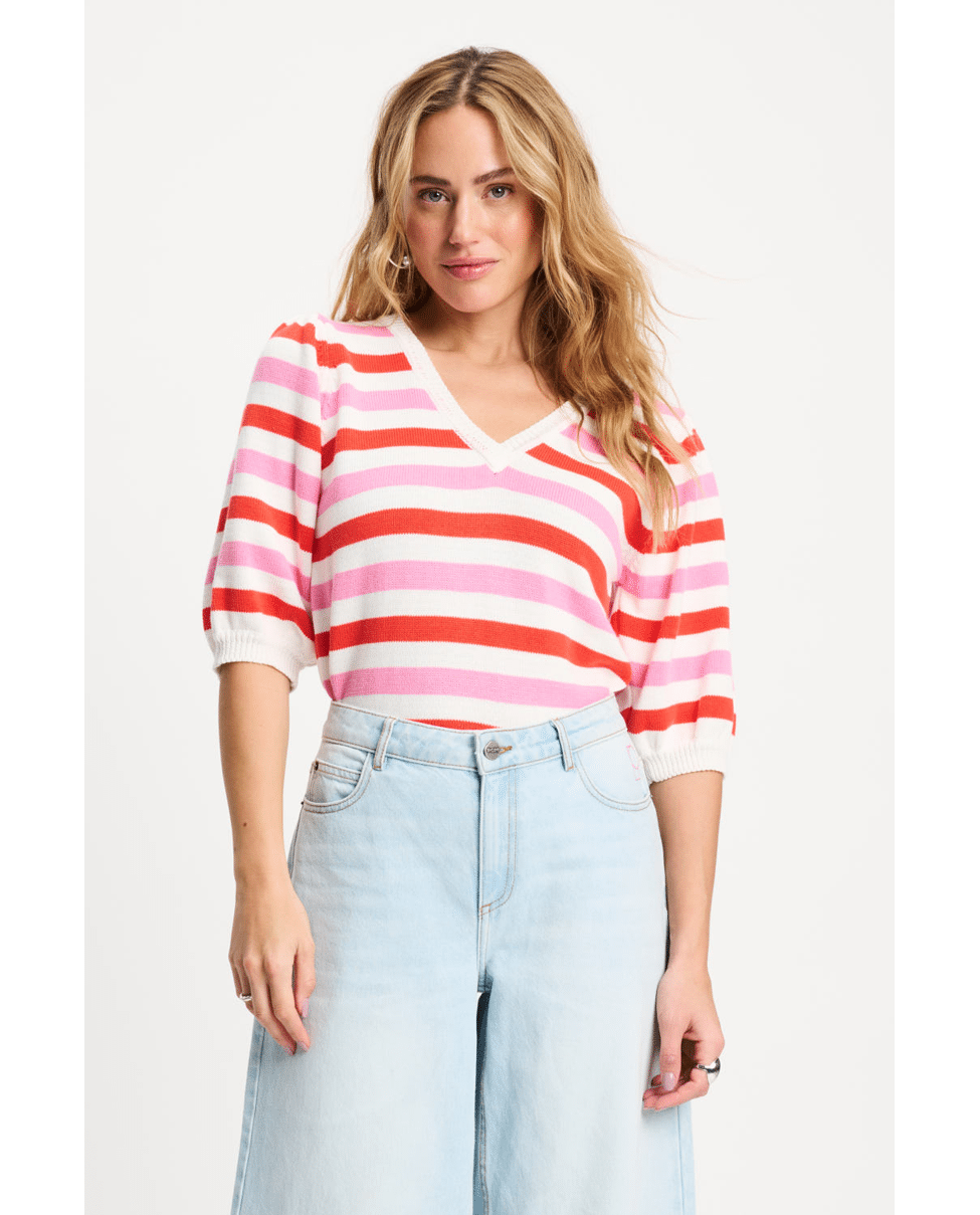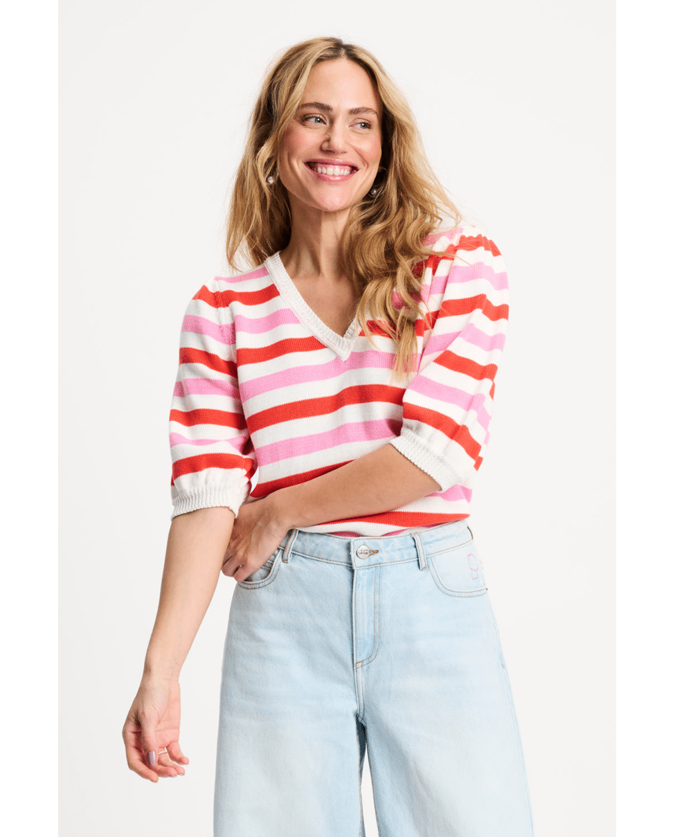 Deze gebreide pullover met V-hals en kleurrijke strepen is een vrolijke toevoeging aan je lente- en zomergarderobe. Ideaal voor frisse ochtenden of koele zomeravonden.