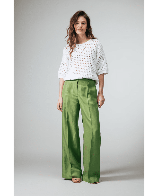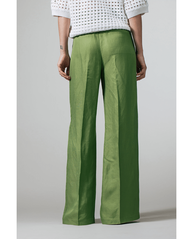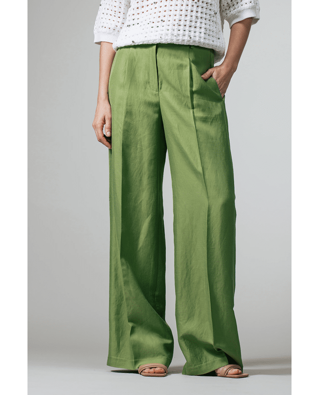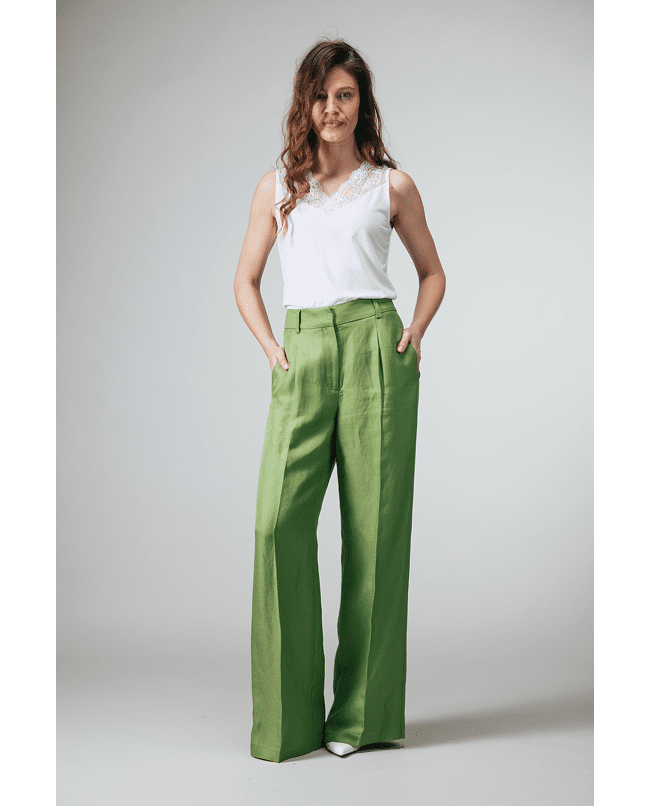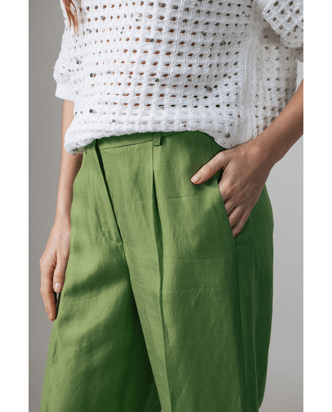 Deze groene pantalon met bandplooien is een tijdloze basis voor het lente- en zomerseizoen. De natuurlijke stof en rustige uitstraling maken dit een veelzijdig item voor elke dag.