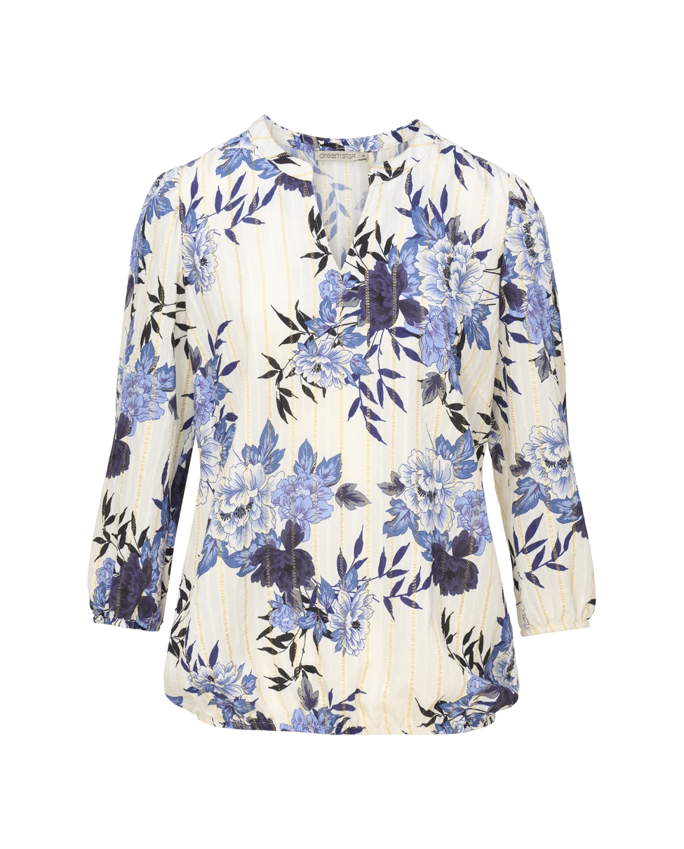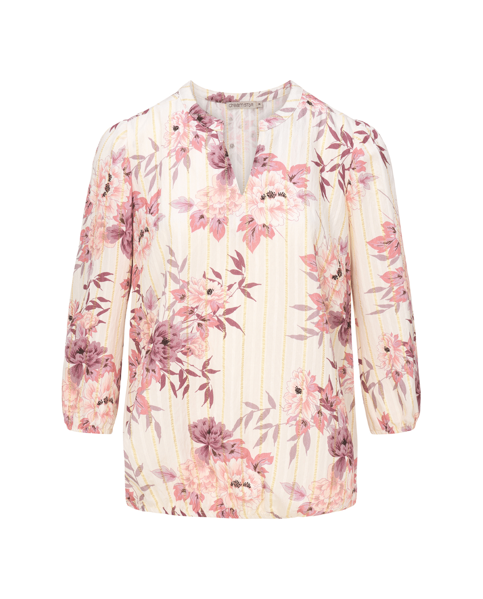 Een vrouwelijke blouse met 3/4 mouw, sierlijke bloemenprint en subtiele lurex glans. De perfecte mix van elegantie en comfort voor de lente en zomer.