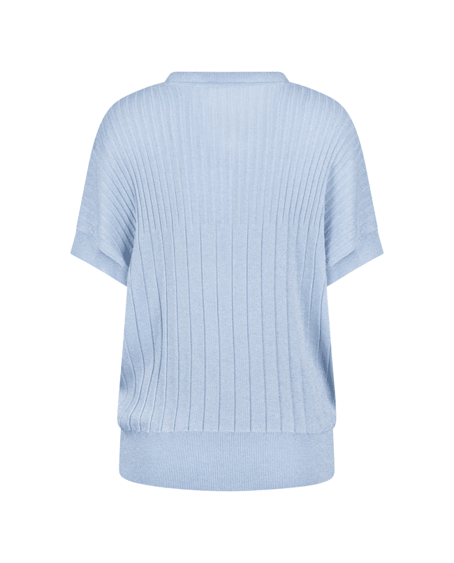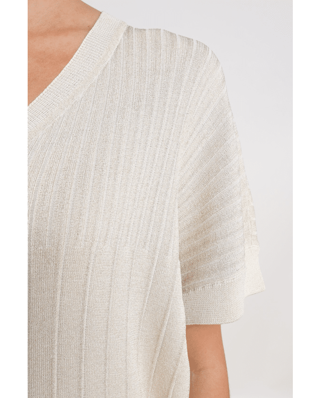 De glanzende lurexdraad in combinatie met de verticale rib geeft een luxe, vrouwelijke uitstraling – moeiteloos chic.
