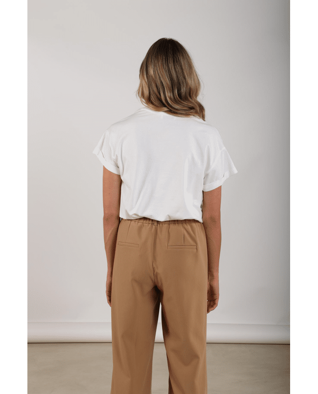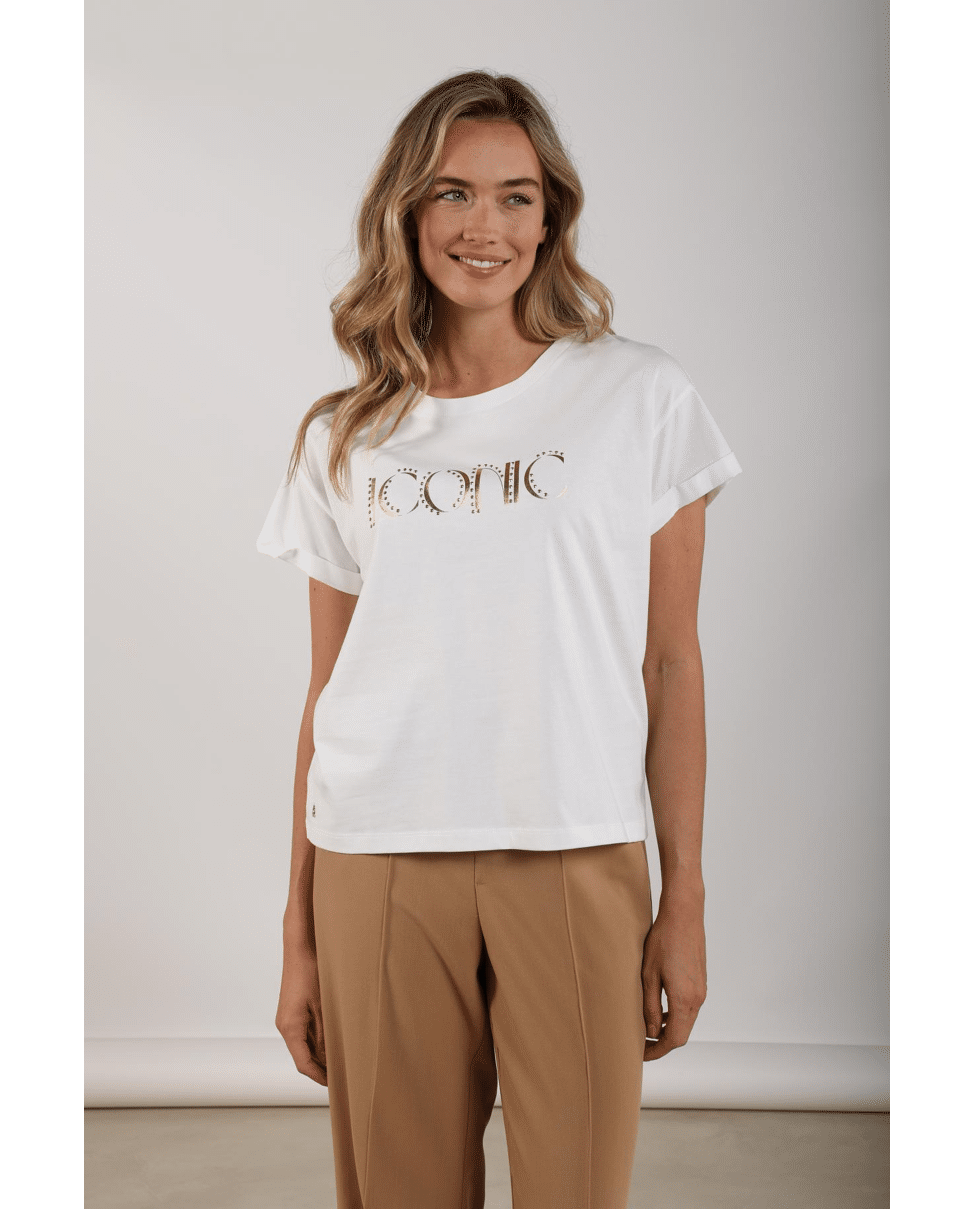 Met z’n gouden ‘ICONIC’-print en opgerolde mouwen is dit T-shirt een stijlvolle knipoog naar klassiek comfort. De zachte katoenkwaliteit zorgt voor een relaxed gevoel, de glanzende details voor een opvallende look.