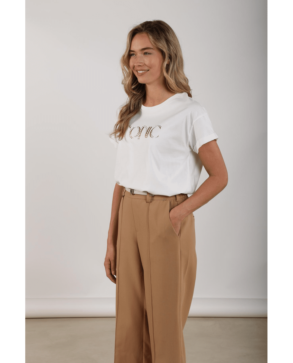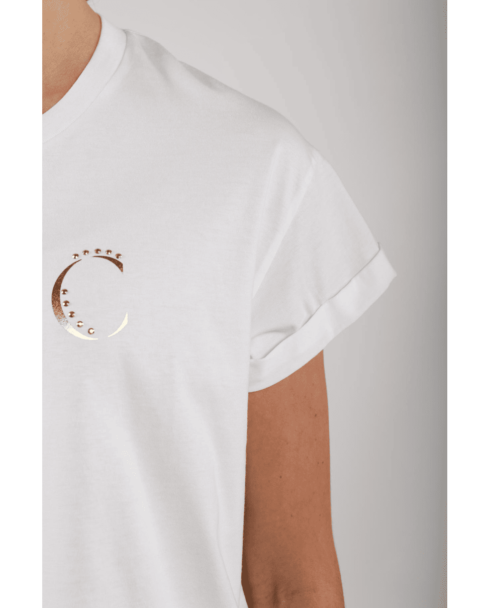 De combinatie van goudfolie en studs geeft dit shirt nét dat beetje extra. Perfect voor casual looks met een vleugje glamour.