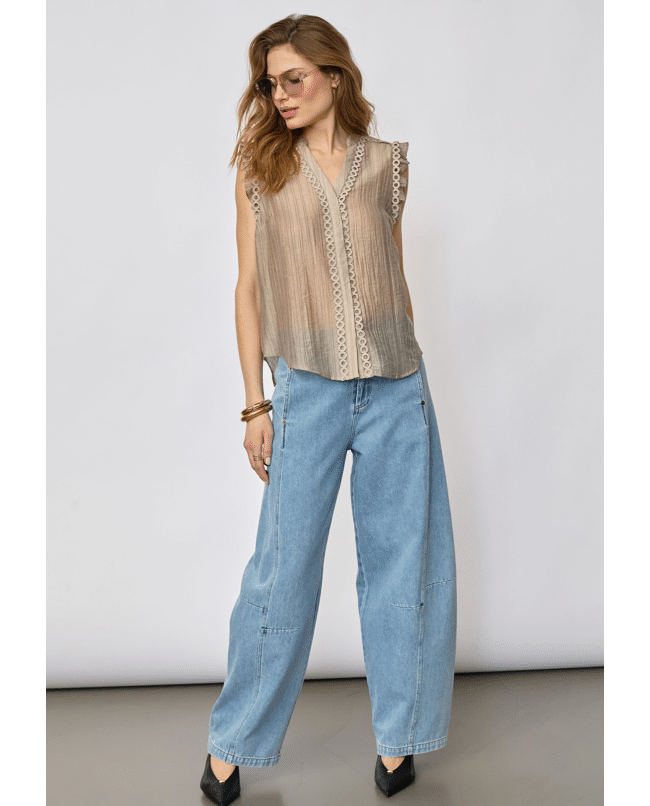 De cirkelvormige sierband en verfijnde knoopsluiting maken deze top net even anders. Mooi onder een blazer of op een short voor een nonchalante chic uitstraling.