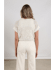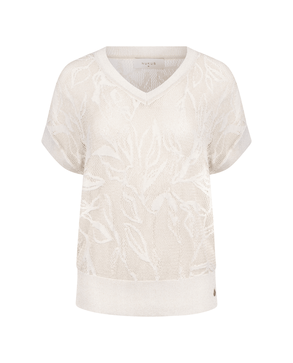 Renza Top - Dames top van Nukus met lichte breistructuur met botanisch motief, V-hals en korte mouwen