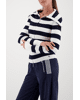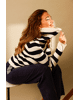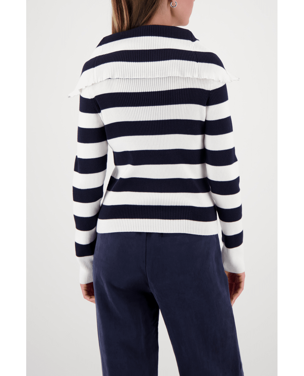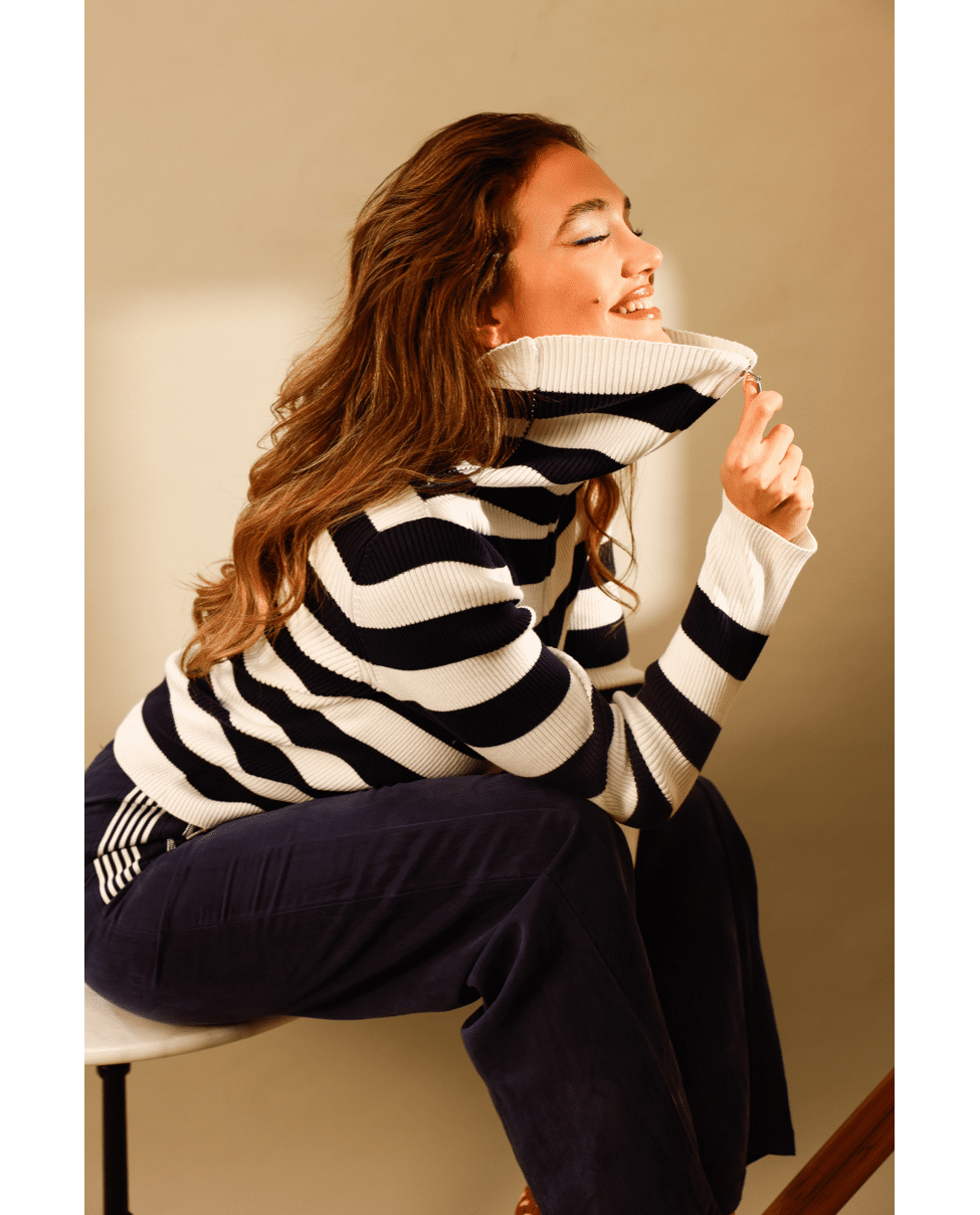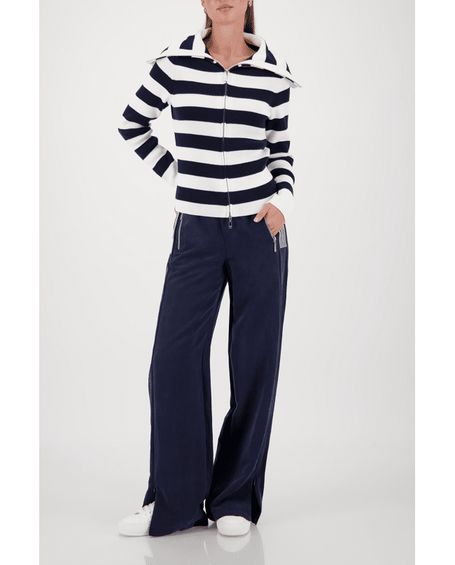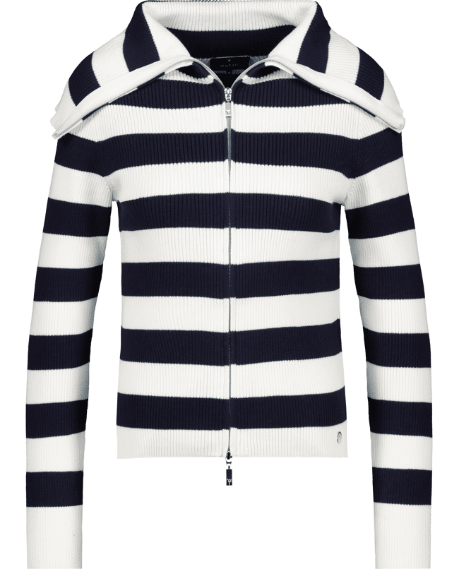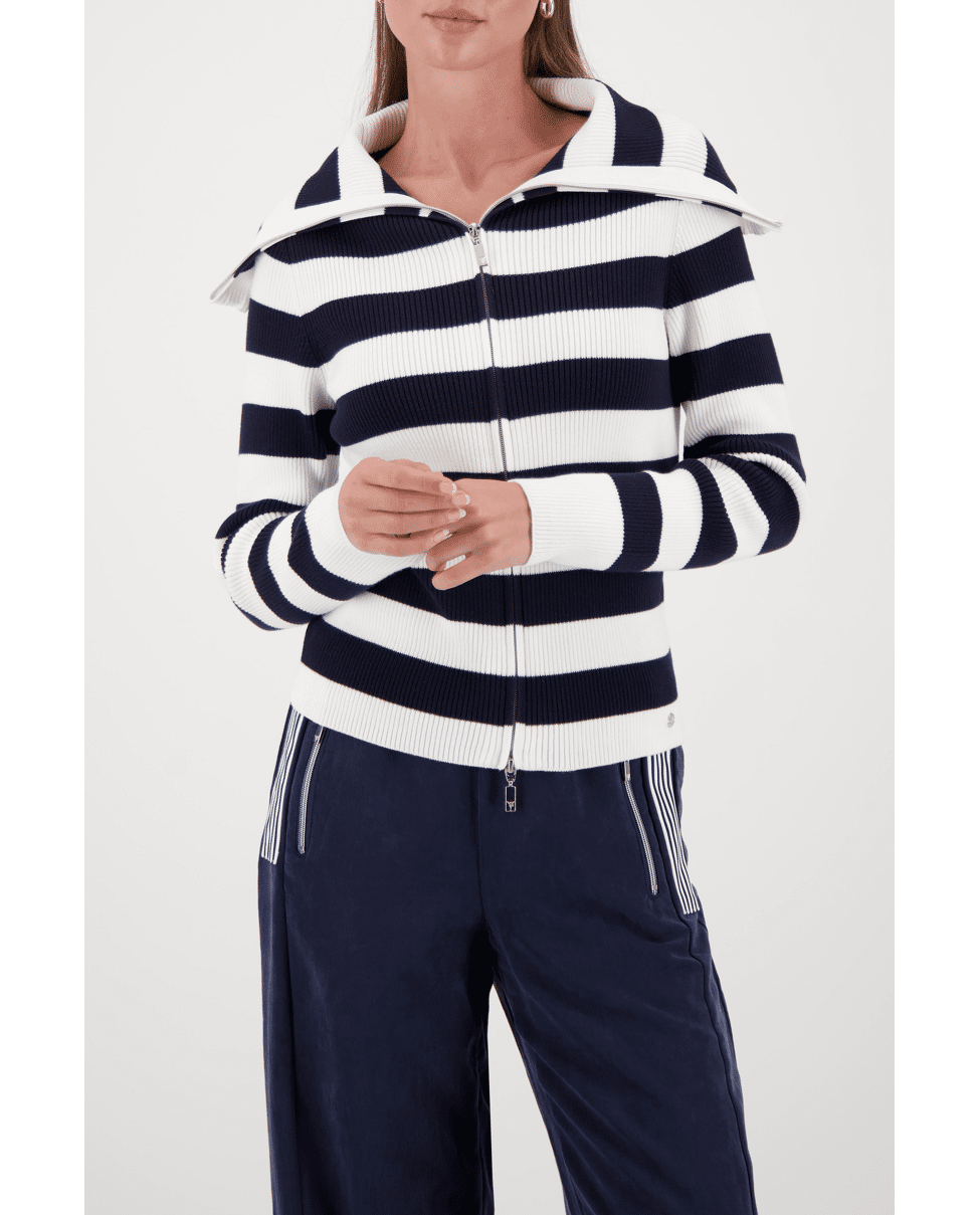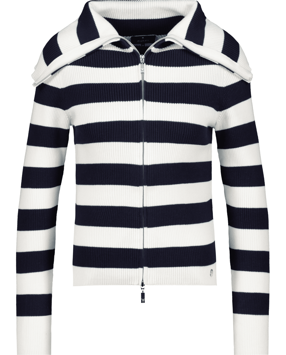 Rib gebreid damesvest van Monari met horizontale strepen, opvallende kraag, ritssluiting en lange mouwen