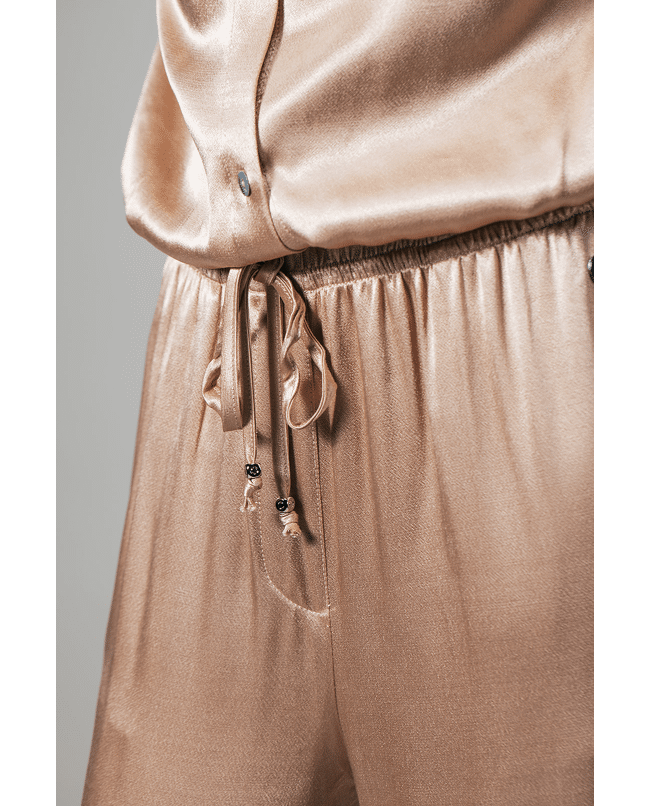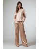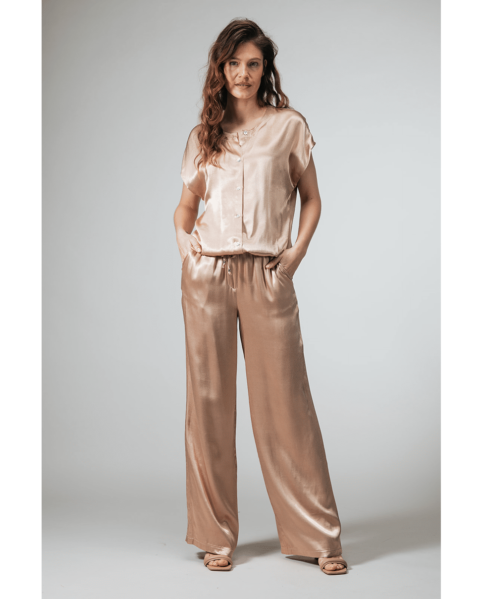 Deze beige palazzobroek is luchtig, elegant en verrassend veelzijdig. De soepele crinkle-stof met subtiele glans geeft de broek een luxe uitstraling, terwijl de wijde pijpen zorgen voor een ontspannen silhouet. Ideaal voor zomerse dagen waarop comfort en stijl samenkomen.