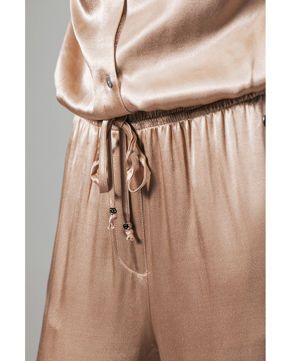 100% viscose. Licht, ademend en zacht, met een mooie valling die meebeweegt bij elke stap.
