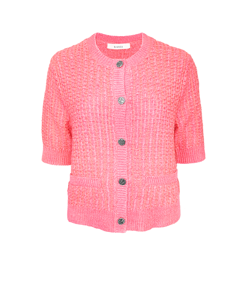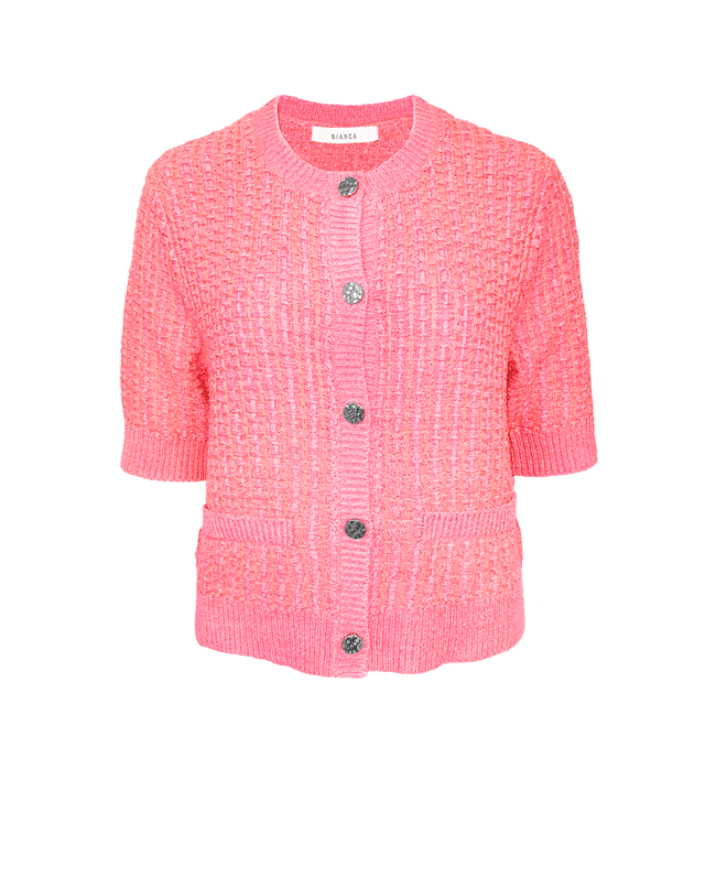 Het RONA gebreide damesvest van Bianca is een frisse toevoeging aan je lente- en zomergarderobe. De roze kleur en het verfijnde breipatroon geven dit vest een vrouwelijke, stijlvolle uitstraling. Mooi om los te dragen of licht open over een top of jurk.