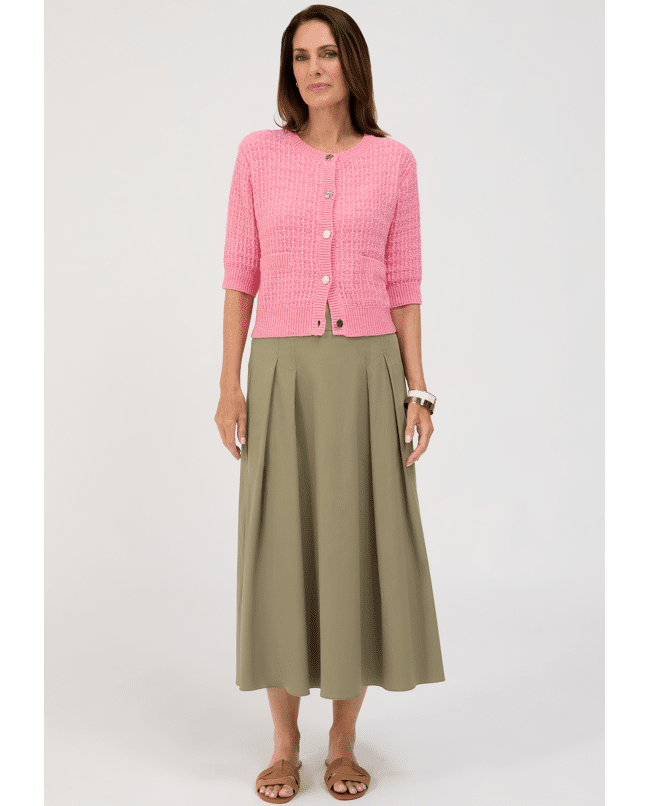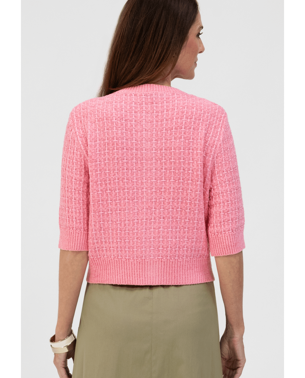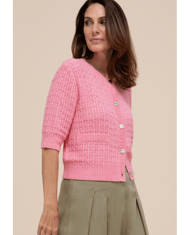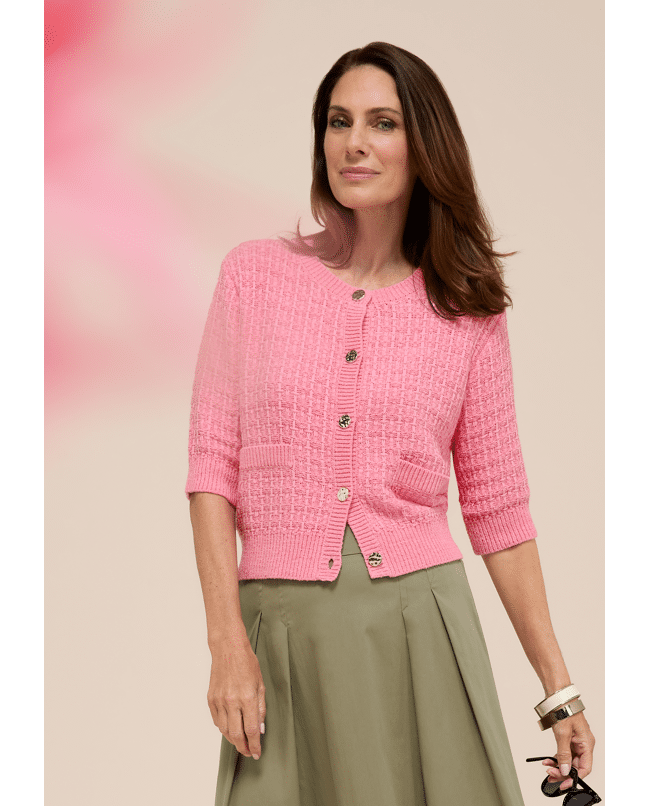 De halflange mouwen en sierknopen geven dit roze damesvest net dat beetje extra. Ideaal voor frisse ochtenden of een avond waarop je iets luchtigs over je outfit wilt dragen.