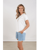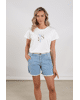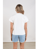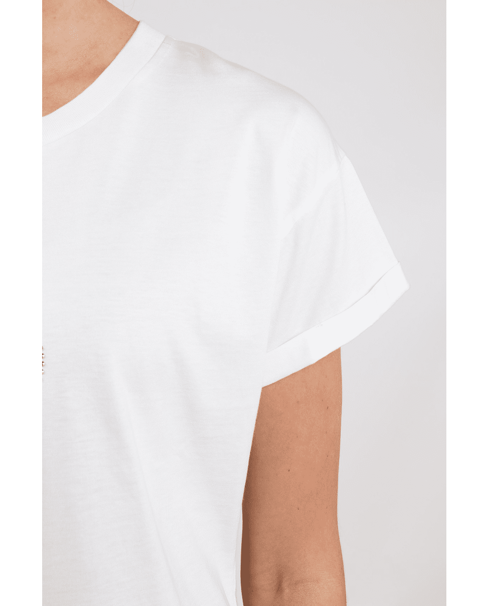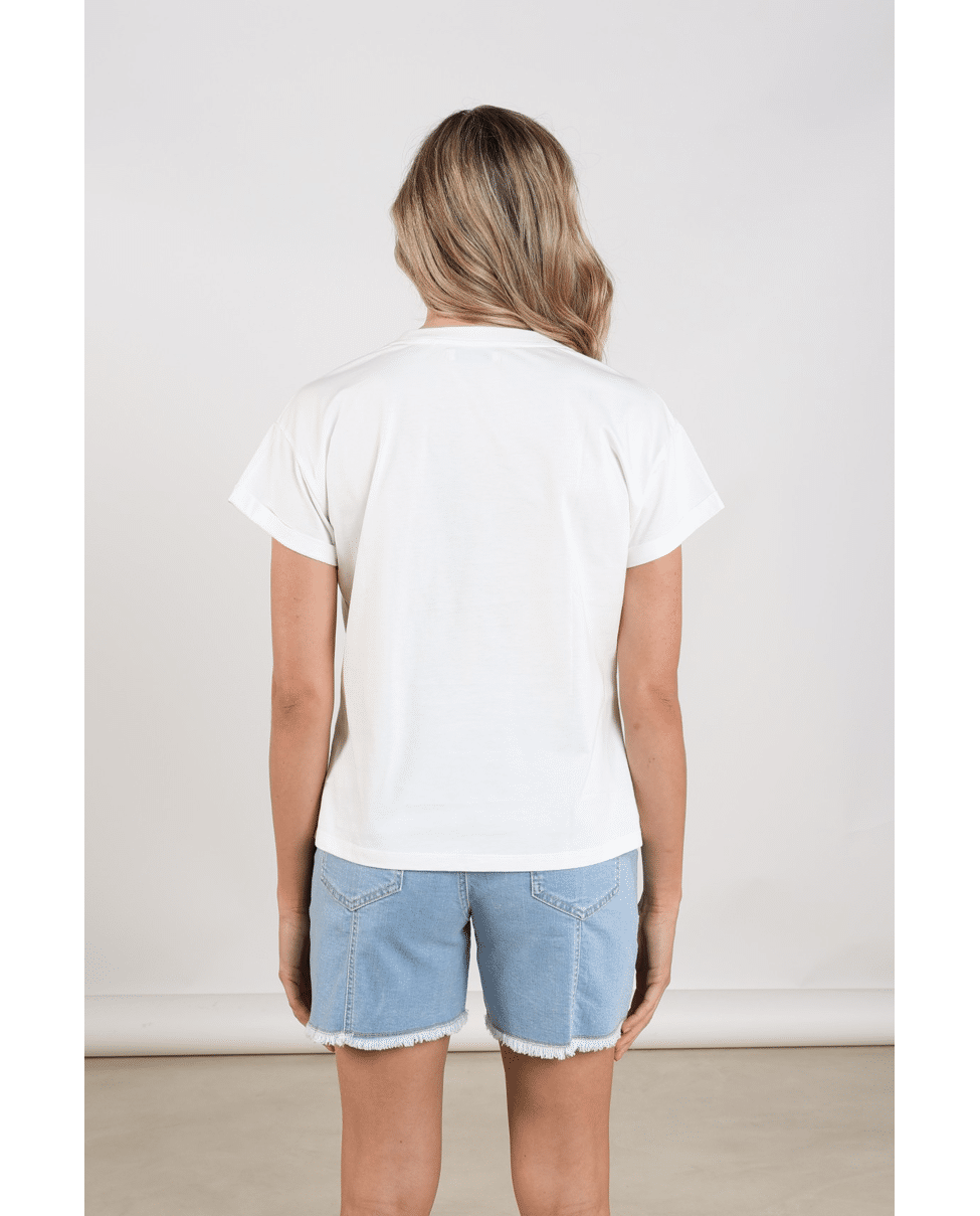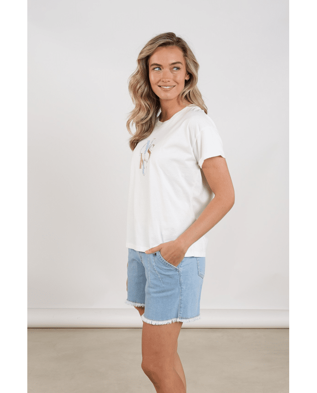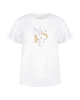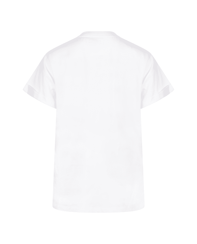 Een fris wit T-shirt met speels logo in zachte tinten. Perfect voor casual dagen met een vleugje glans.
