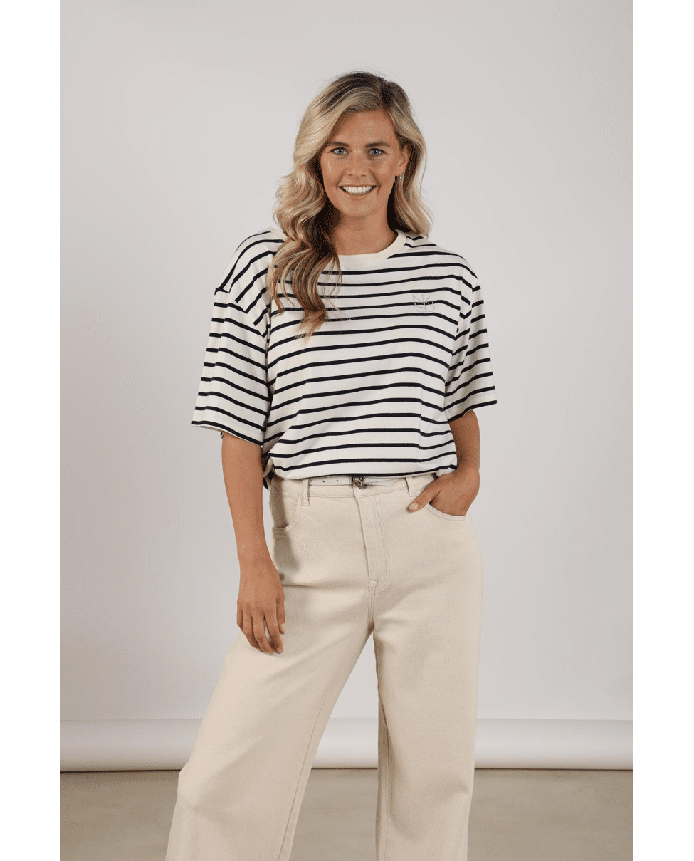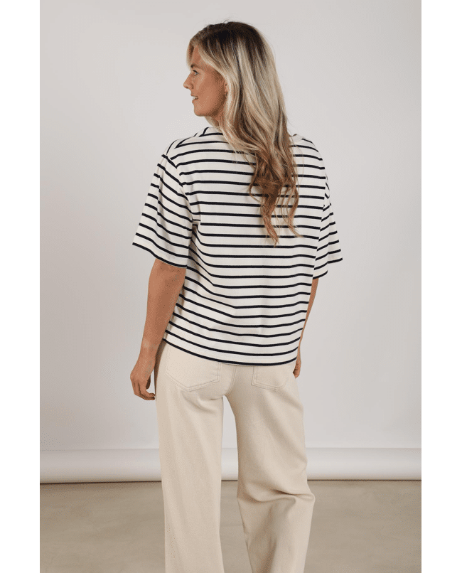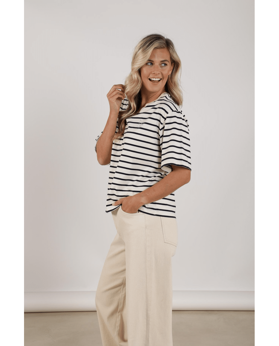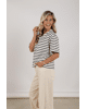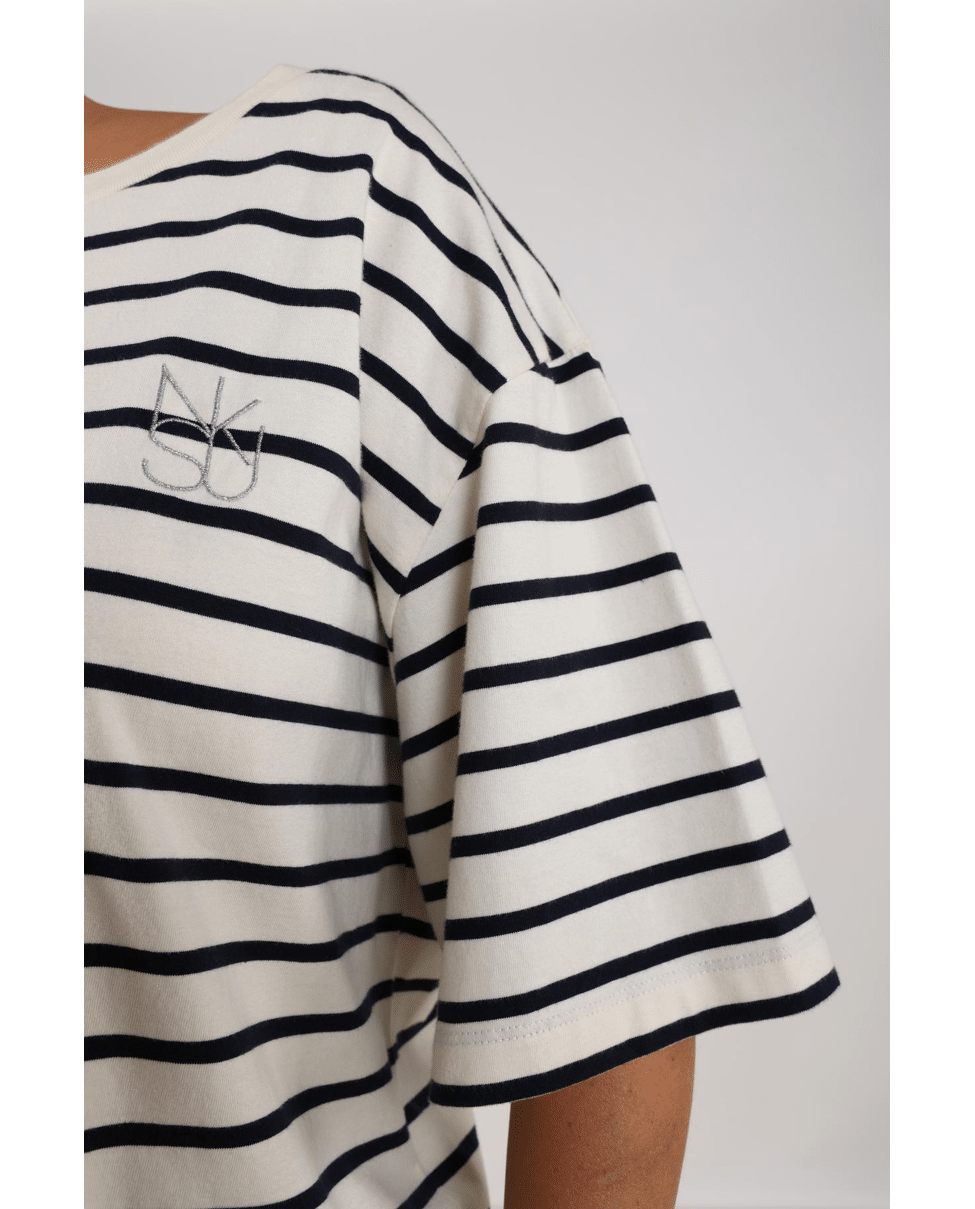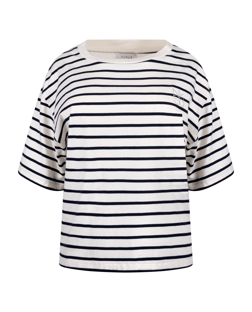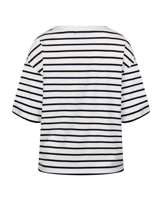De offwhite/navy strepen en het subtiele borstlogo zorgen voor een sportieve, tijdloze uitstraling. Makkelijk te combineren en altijd goed.