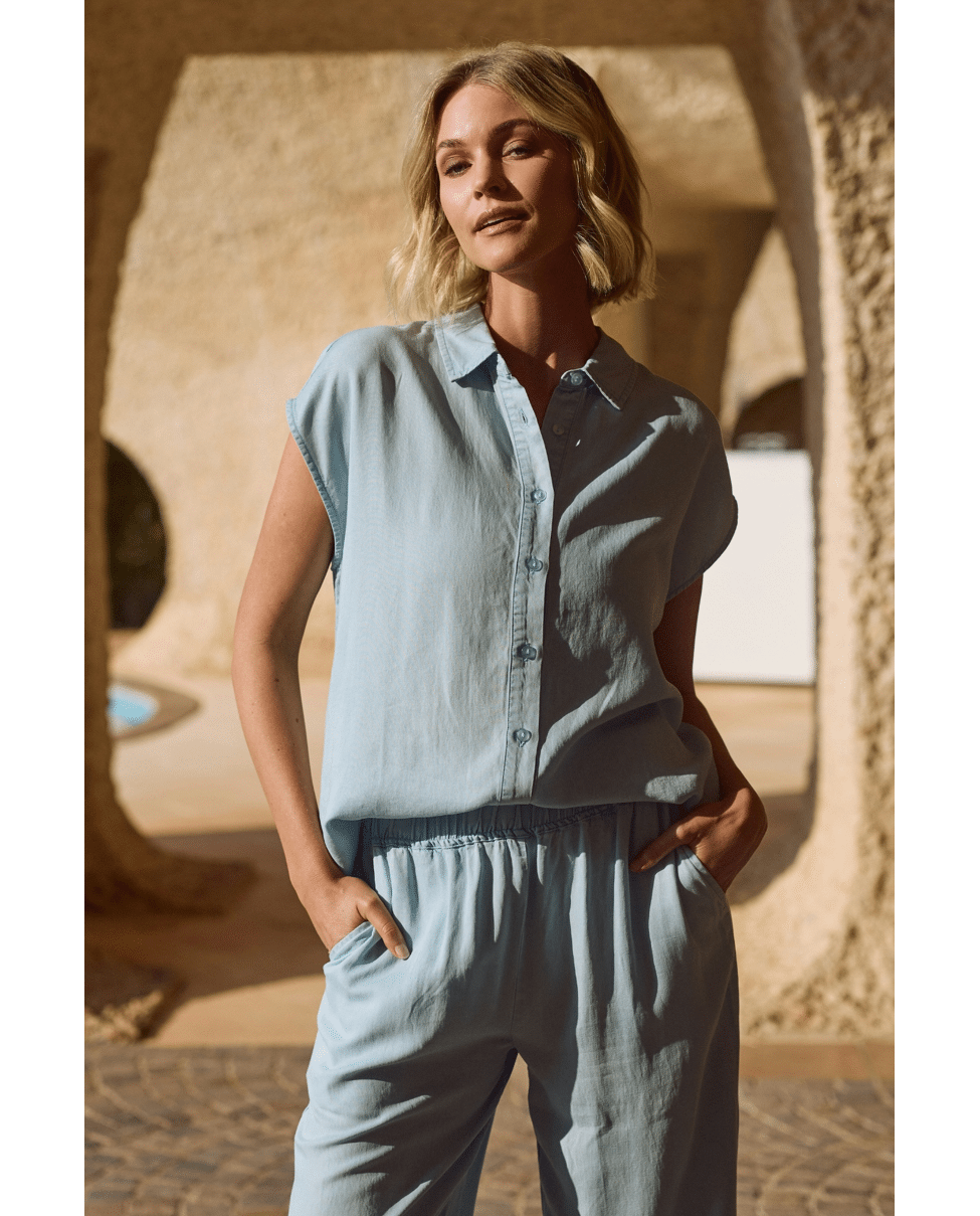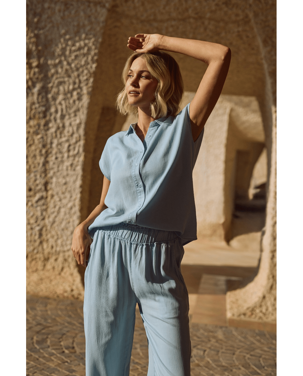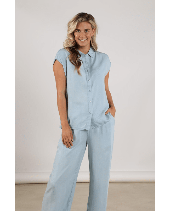 De zachte, denimlook tint in combinatie met de vloeiende stof geeft deze top een moderne en moeiteloos chique uitstraling. Perfect als set met de Novi Pants.