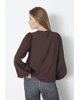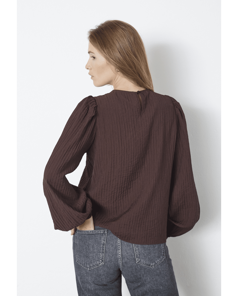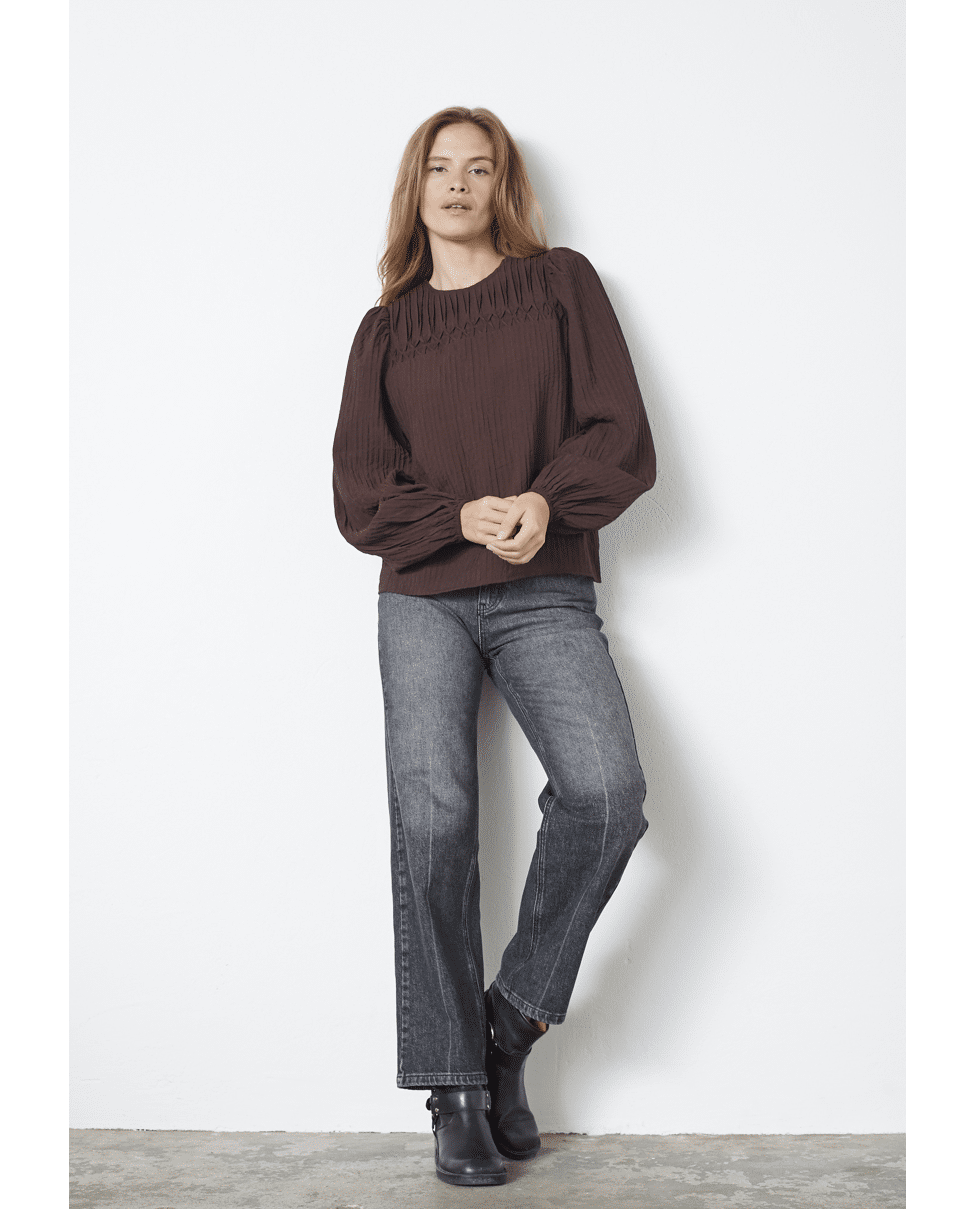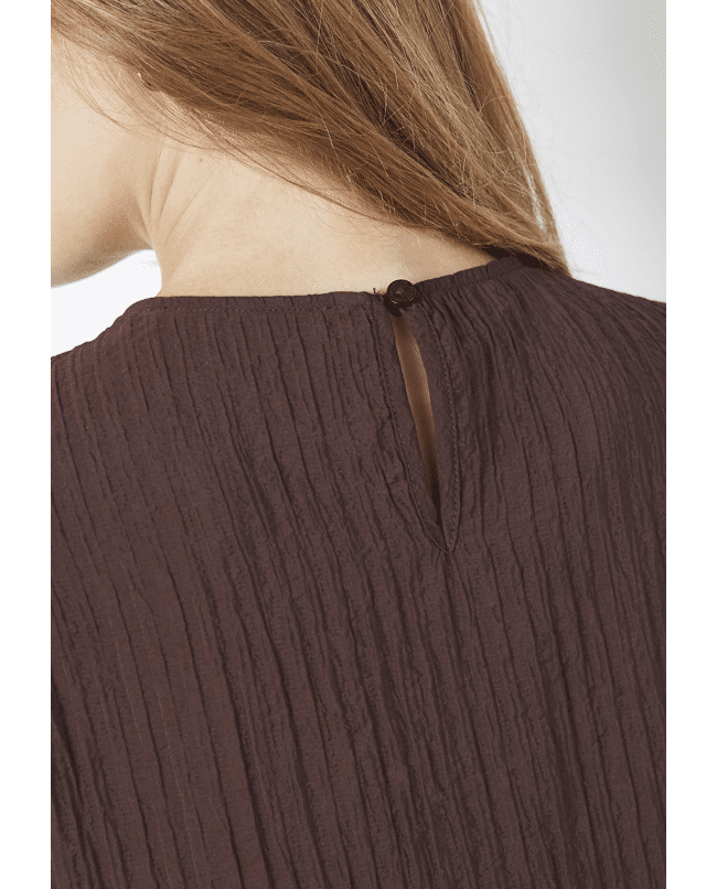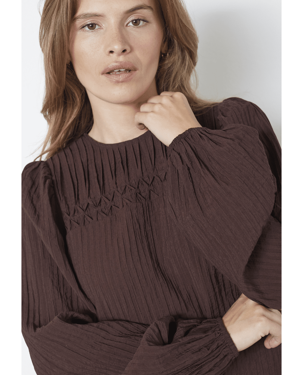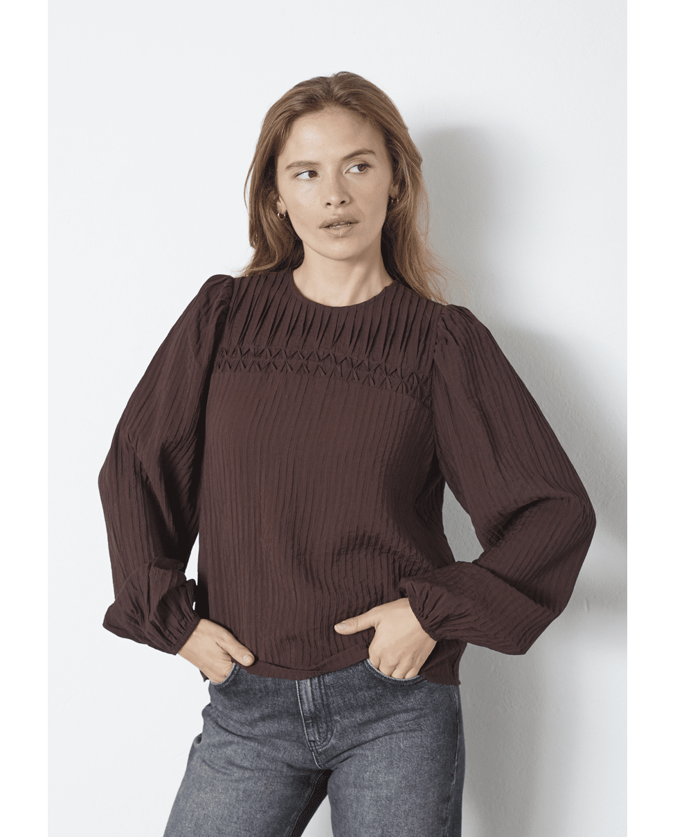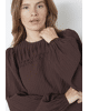 Deze damesblouse is gemaakt van een luchtige viscosemix en heeft verfijnde plooidetails op het voorpand. De diepe bruine kleur maakt het een krachtig en stijlvol item.