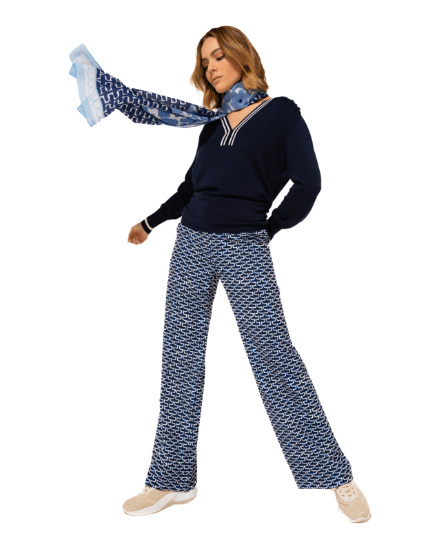Deze luchtige sjaal van Caroline Biss valt op door de grafische walvisprint in frisse blauwtinten. Ideaal om je outfit nét dat beetje extra te geven.