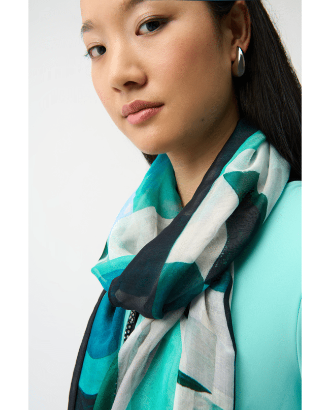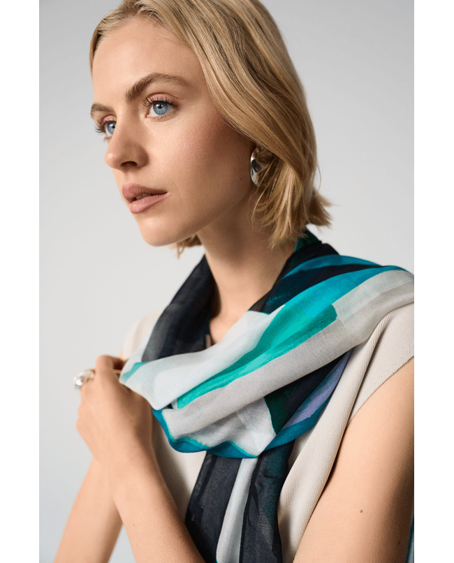Geef elke look een boost met deze lichtgewicht viscose sjaal met een opvallende geometrische print, afgebiesde randen en de kenmerkende JR-muntaccenten met zachte franjes.