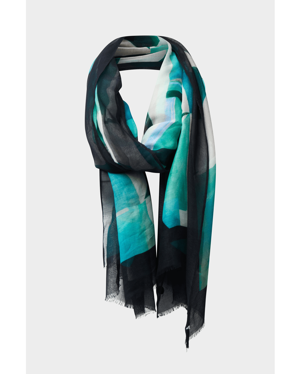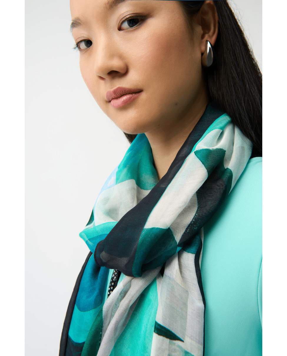 Dames sjaal van Joseph Ribkoff met geometrische print en randen met korte franjes aan de uiteinden