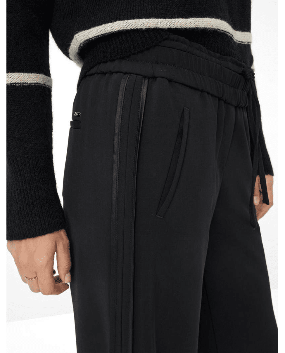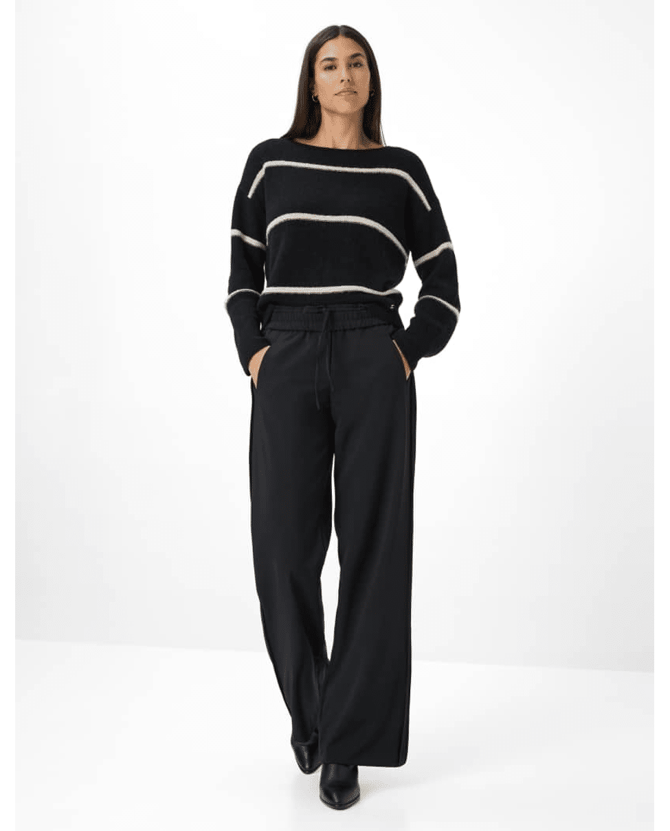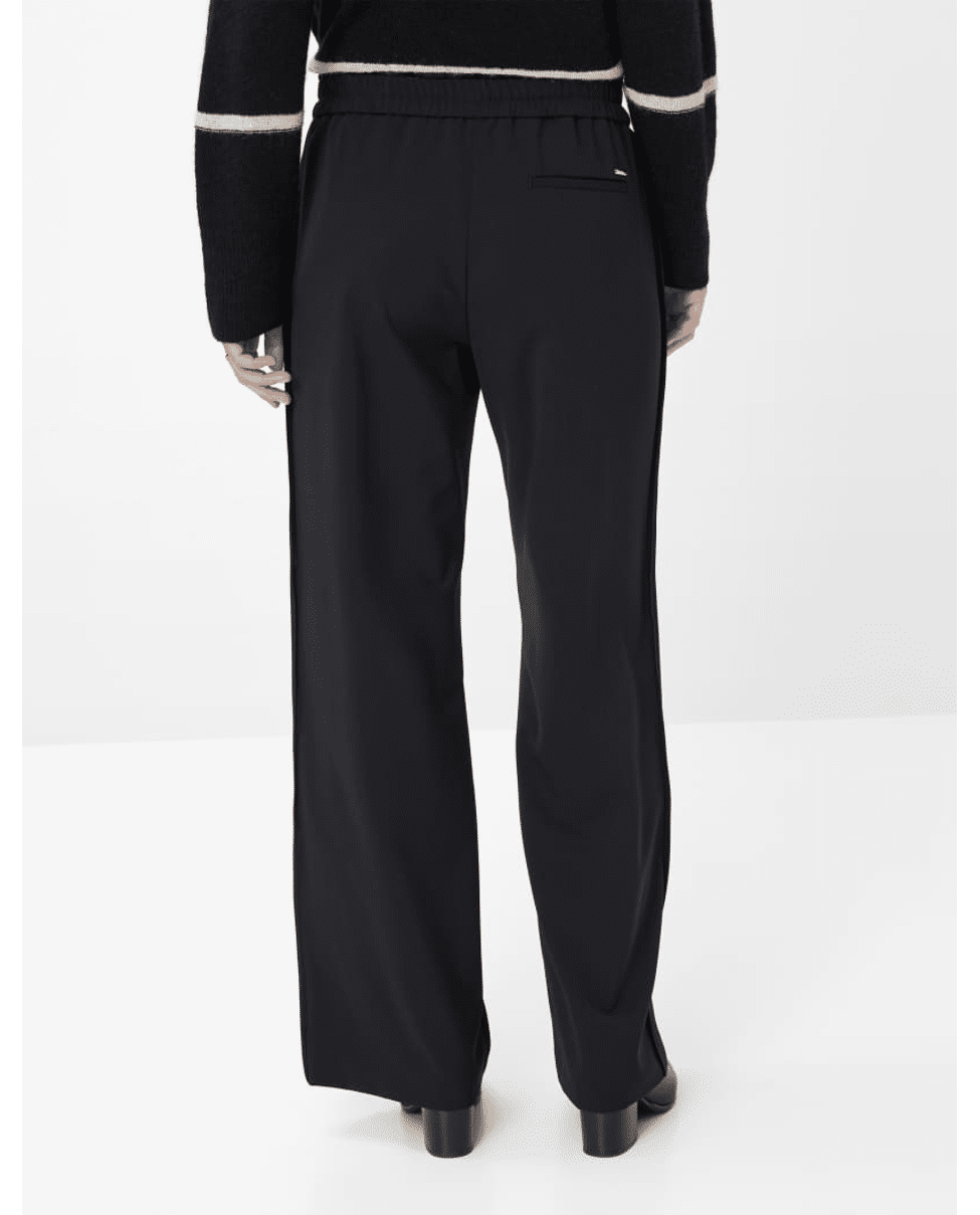 De elastische tailleband zorgt voor draagcomfort, aangevuld met een vrouwelijke strikceintuur die de taille subtiel accentueert. De klassieke flatfront en subtiele paspelzakken benadrukken de cleane lijnen, terwijl de elegante galonstreep langs het been optische lengte creëert en de trendy uitstraling versterkt.