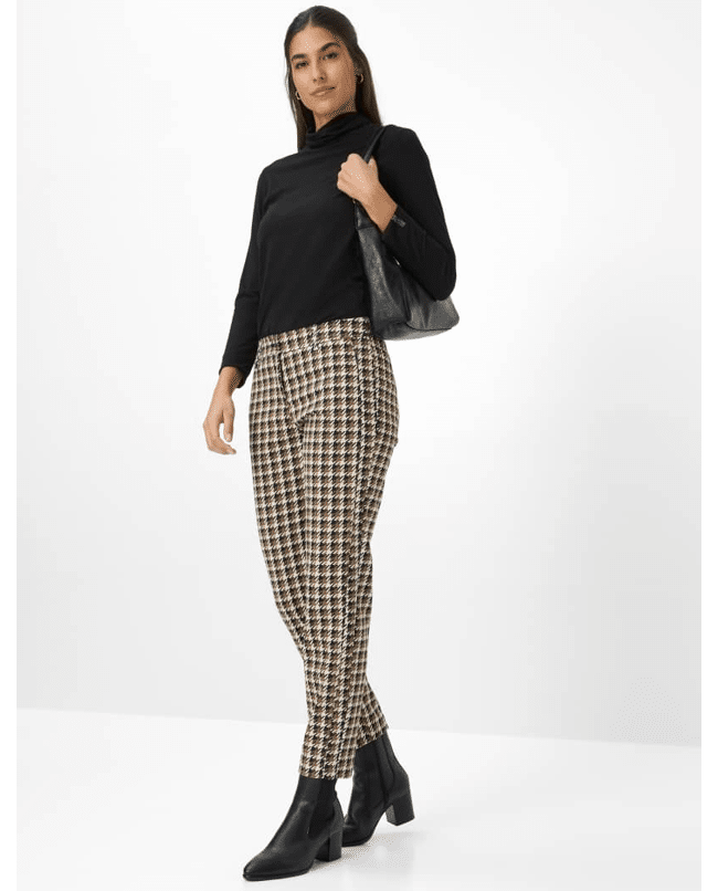 Een krachtig statement voor vrouwelijke looks biedt deze chino in de stijl MARON S. De modieus geïnterpreteerde pied-de-poule brengt kleur en structuur in het spel en wordt perfect geaccentueerd door de taps toelopende silhouet.