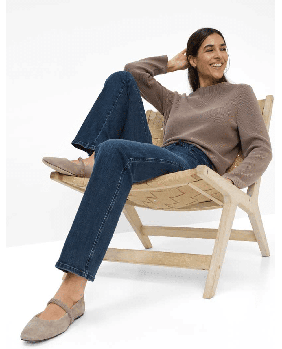 Typische details zoals opgezette achterzakken en steekzakken vullen de moderne Five-Pocket-vorm aan, die door de smalle bindriem en de klassieke persplooi een vrouwelijke touch krijgt. Het trendy karakter van de damesjeans komt echter vooral tot uiting in het materiaal.