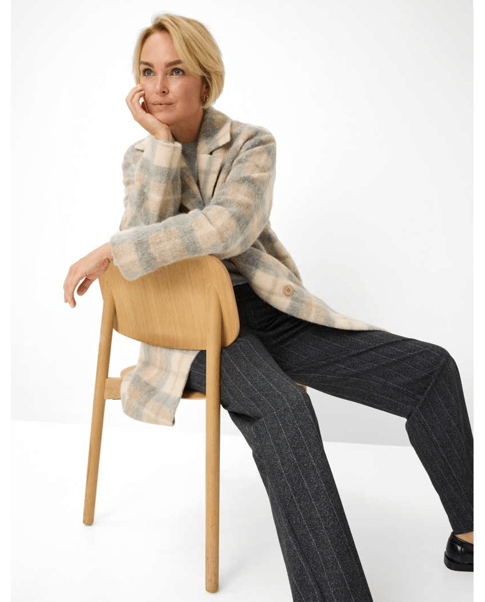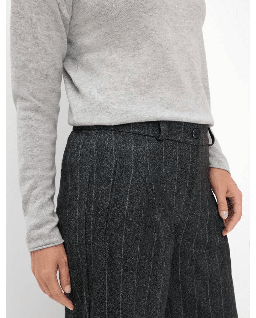 De verborgen ritssluiting en de nauwkeurig geplaatste paspelzakken aan de voor- en achterkant benadrukken de minimalistische look met subtiele verfijning. Bijzonder detail: het fijne krijtstreep patroon.
