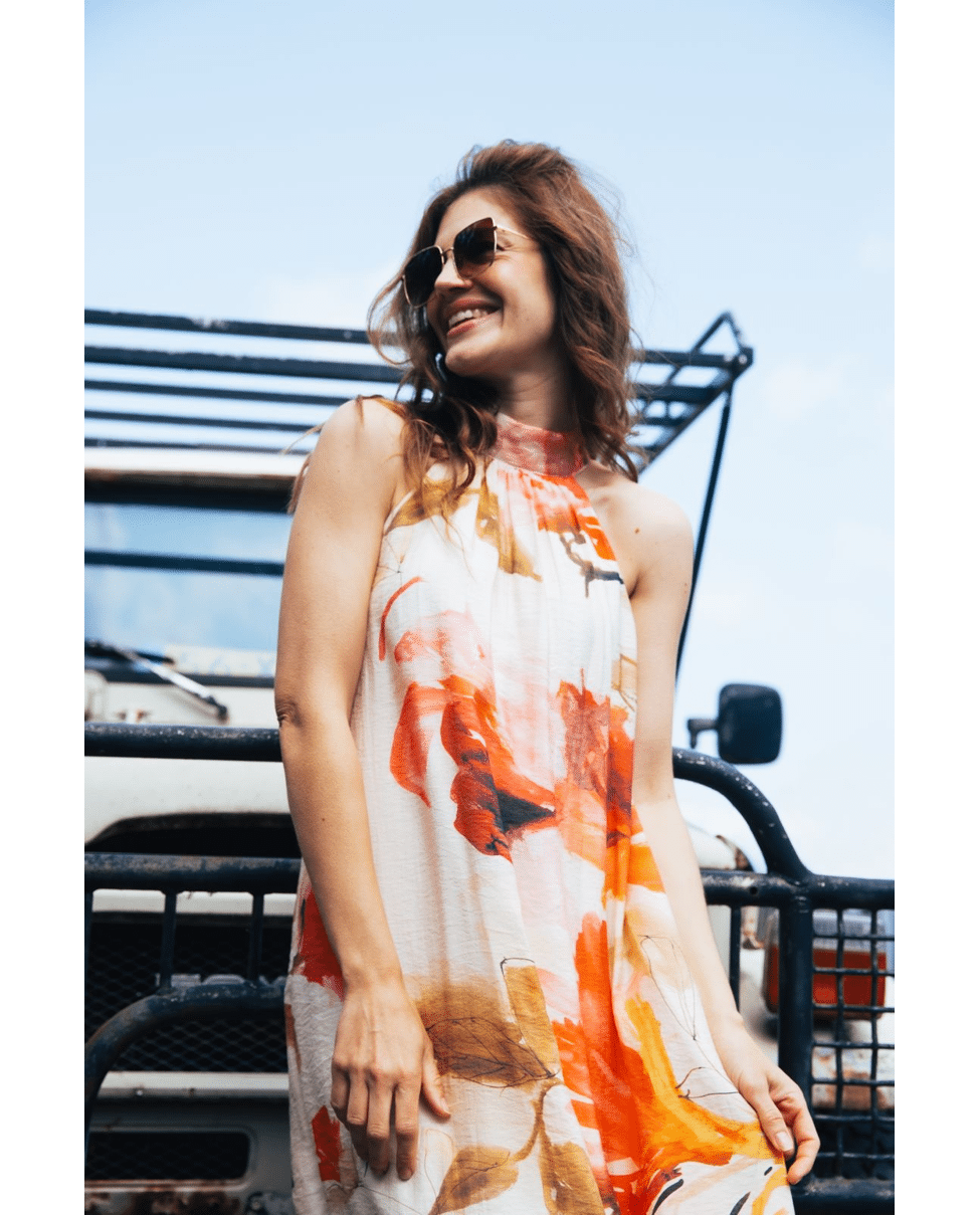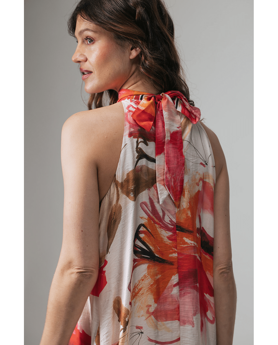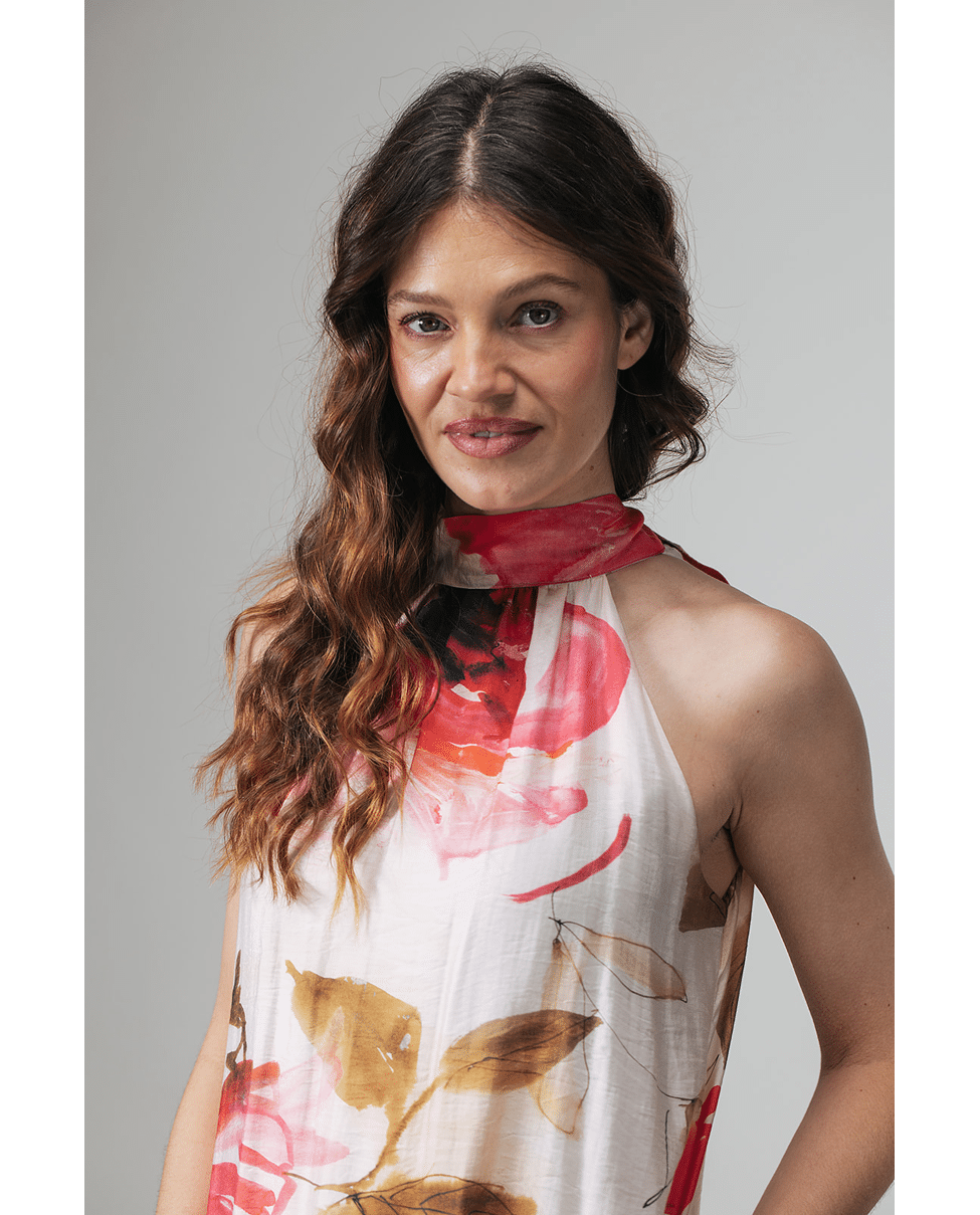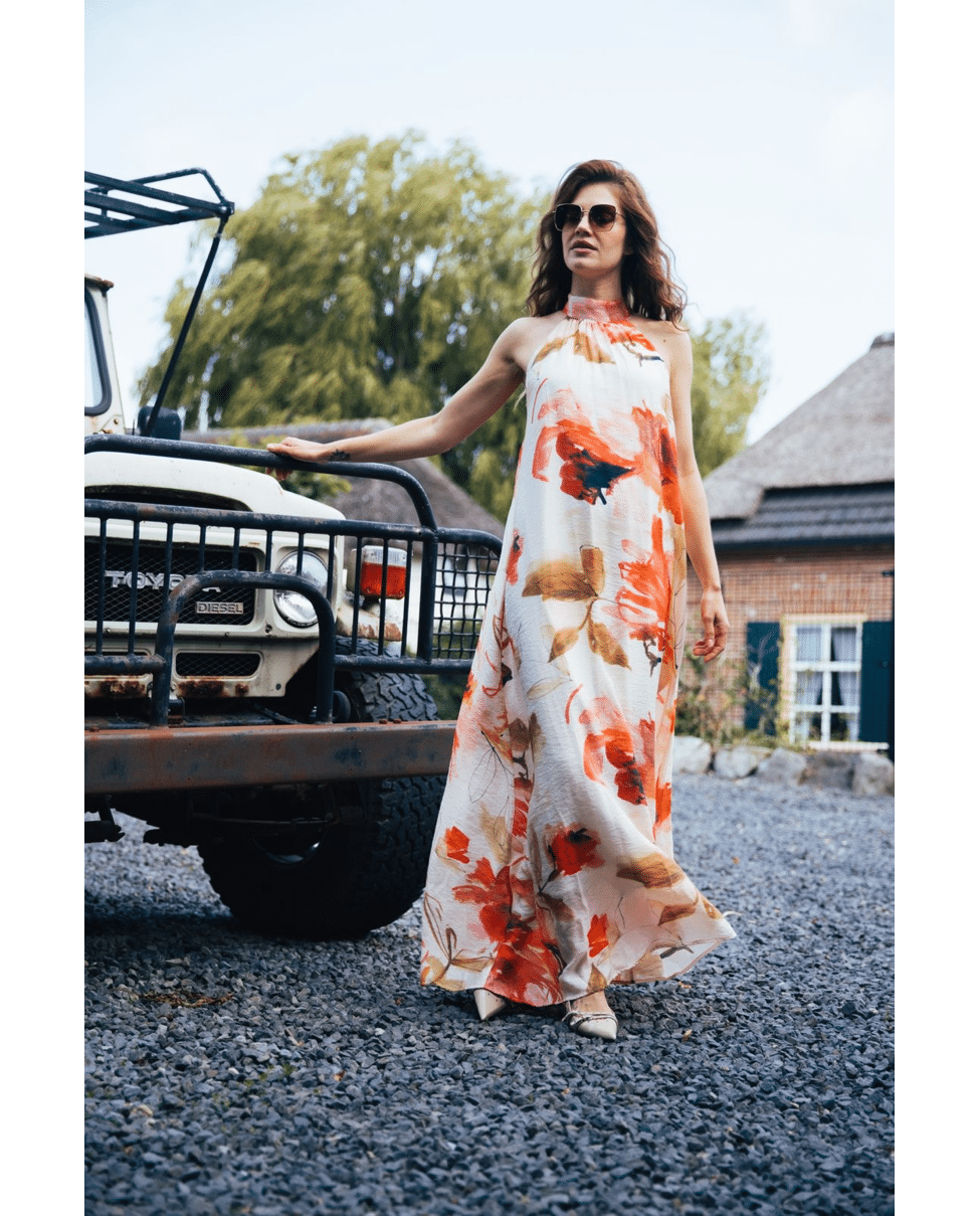Deze maxi-jurk met botanische print is gemaakt om indruk te maken. De vloeiende stof, elegante haltersnit en artistieke print zorgen samen voor een vrouwelijke en zomerse uitstraling. Perfect voor lange avonden, feestelijke momenten of een diner in de zon.
