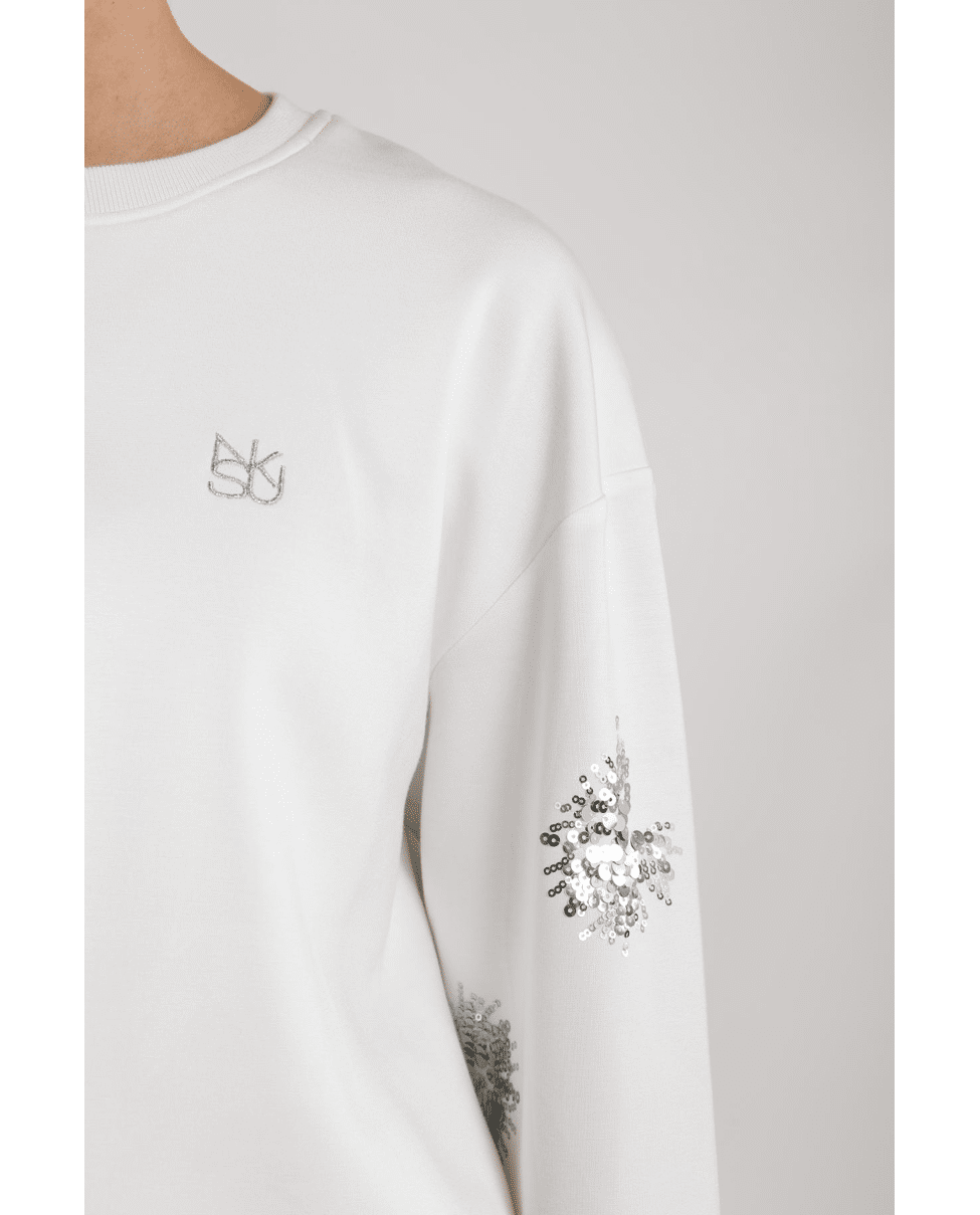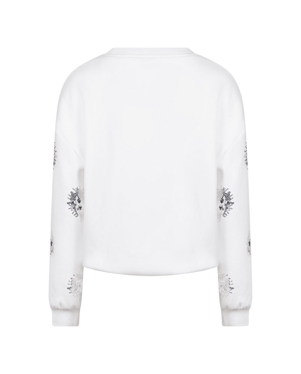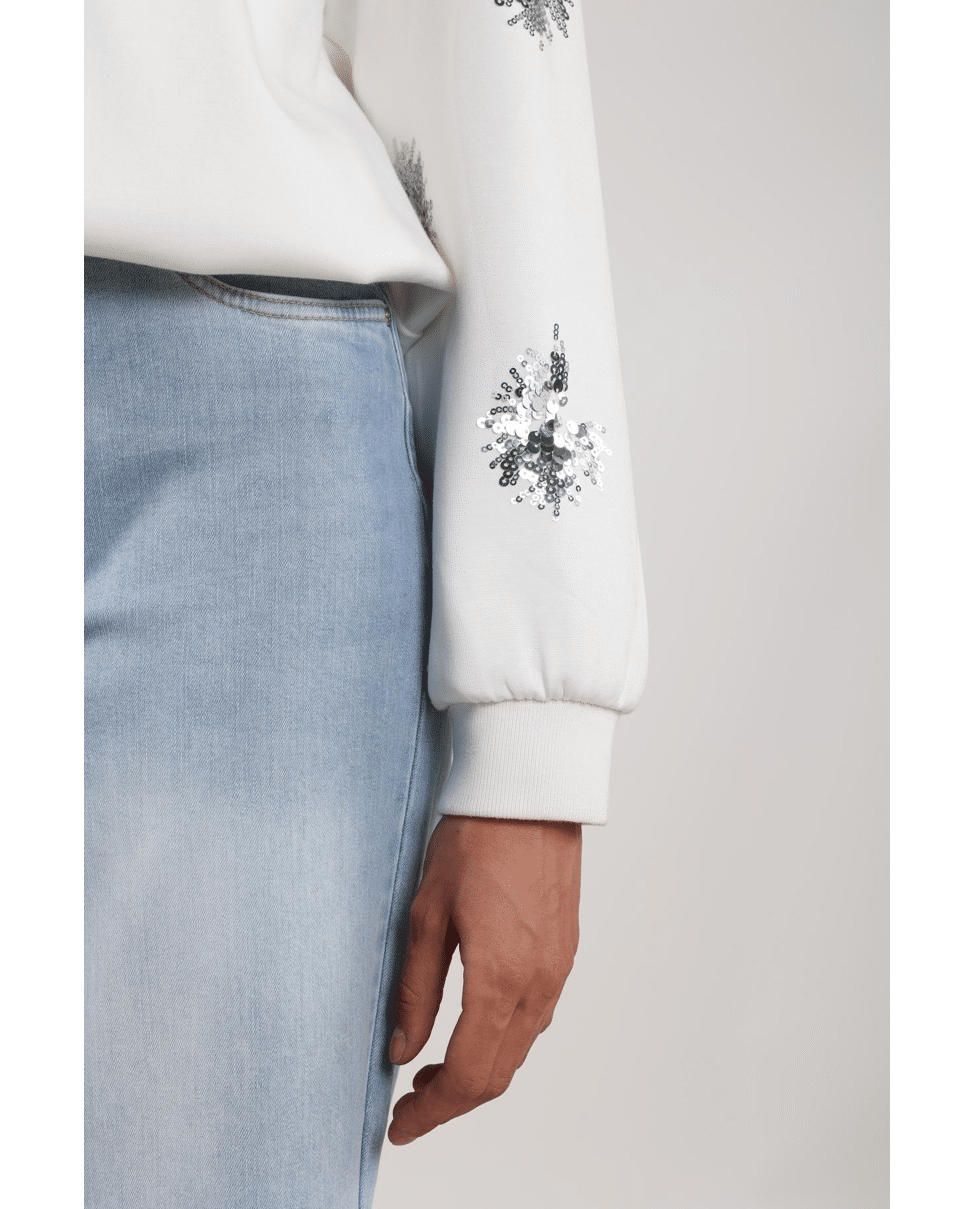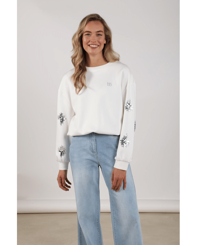 Een lichte pullover met een subtiele paillet-glans, perfect voor frisse lentedagen of een avondje uit. Combineert moeiteloos met denim of een luchtige rok.