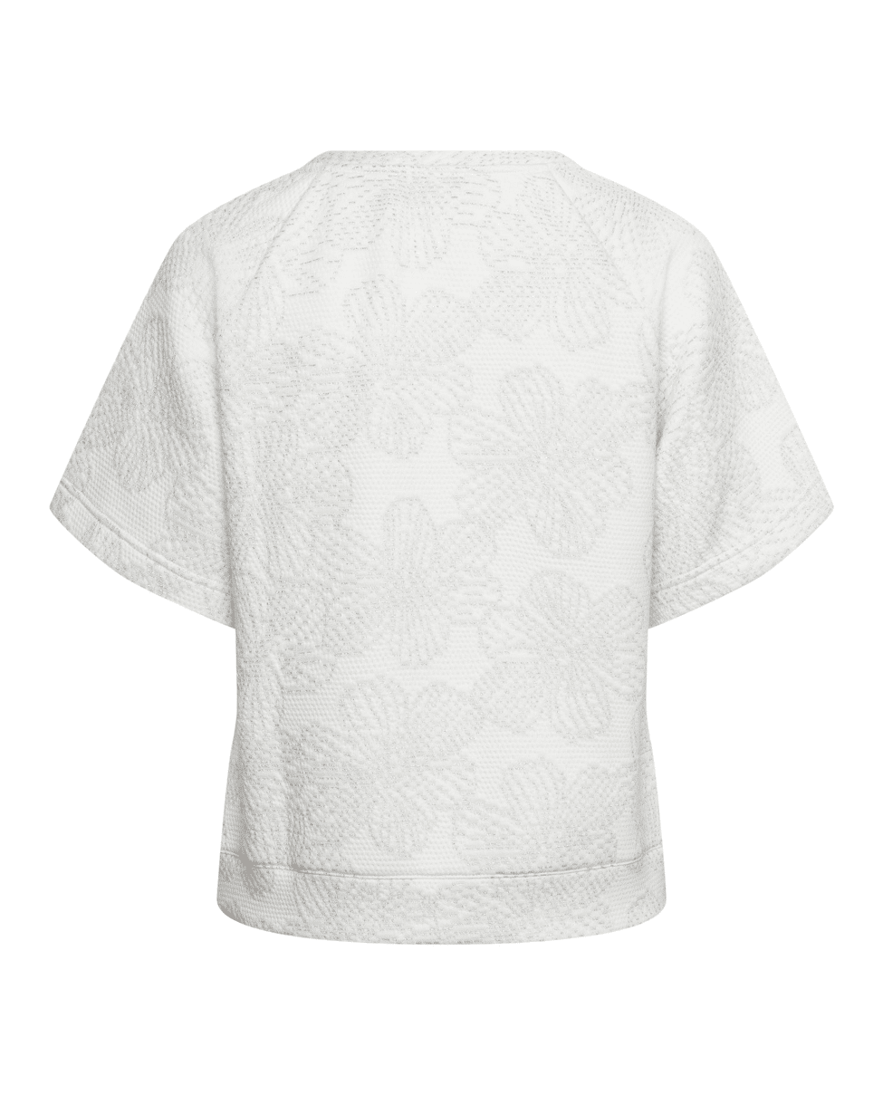 Een vrouwelijke sweater met subtiel bloemdessin in structuurjersey. Luchtig en stijlvol voor de lente en zomer, met een speels reliëfeffect.