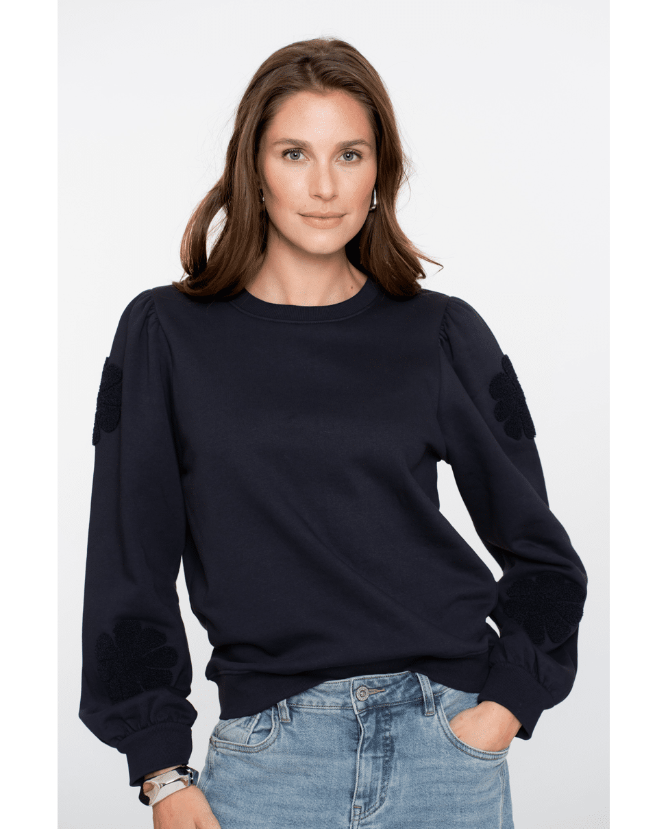 Dames sweater van Geisha met geborduurde bloemen op de lange pofmouwen en ronde hals