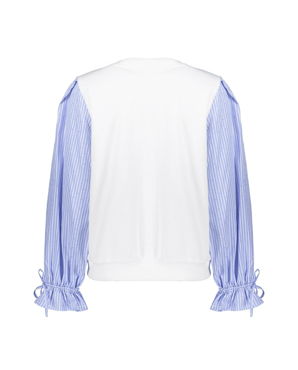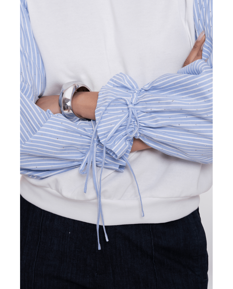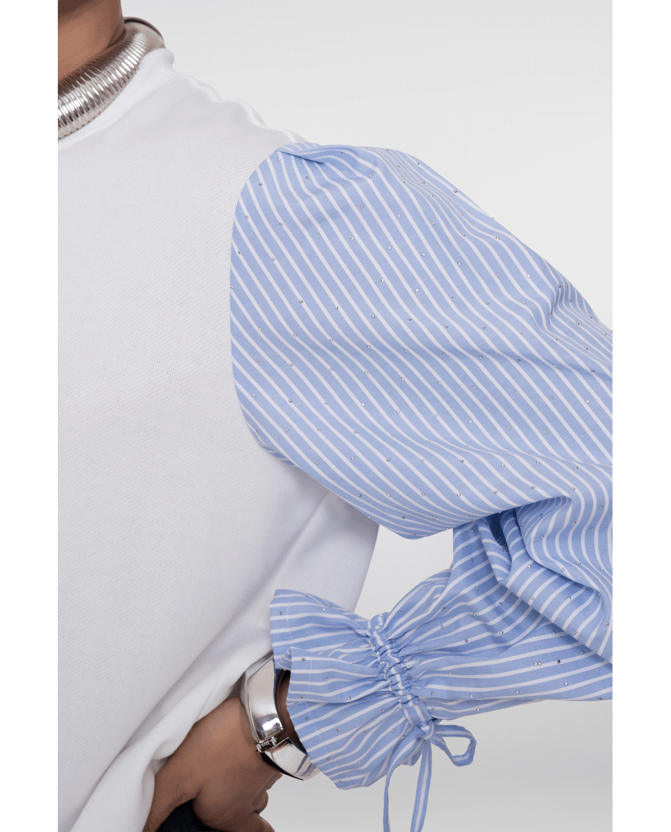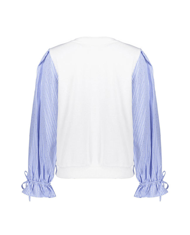 •Contrasterende mouwen met strepen, strassteentjes en strikdetails