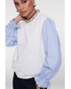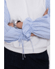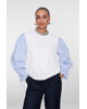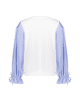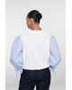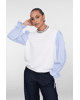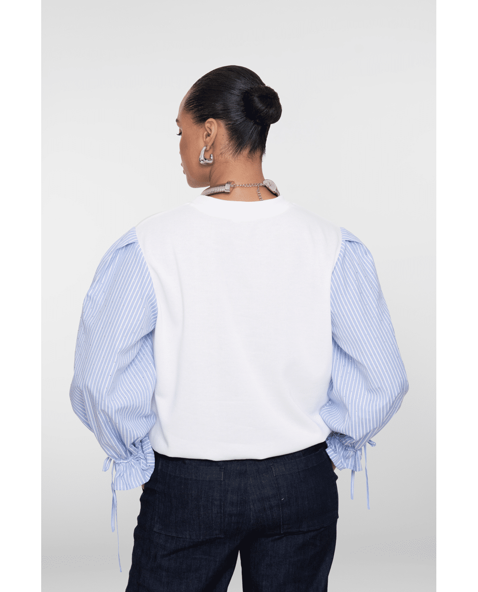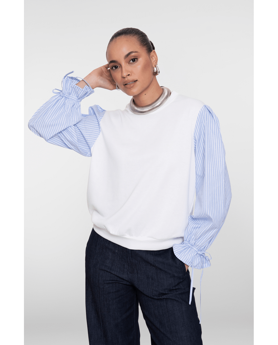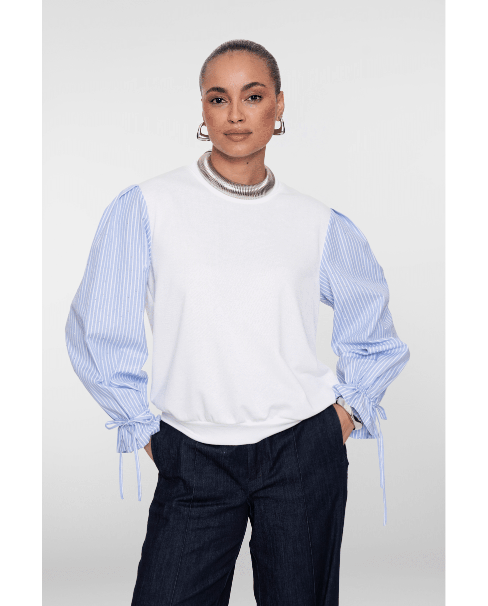 Zachte sweater met een speelse twist, perfect voor frisse lentedagen of relaxte zomerochtenden. De combinatie van effen body met opvallende mouwen geeft een eigentijdse, vrouwelijke look.