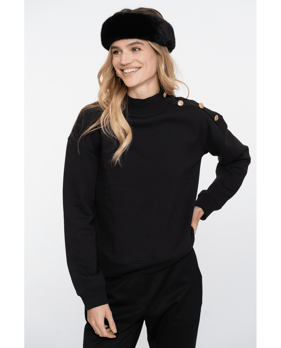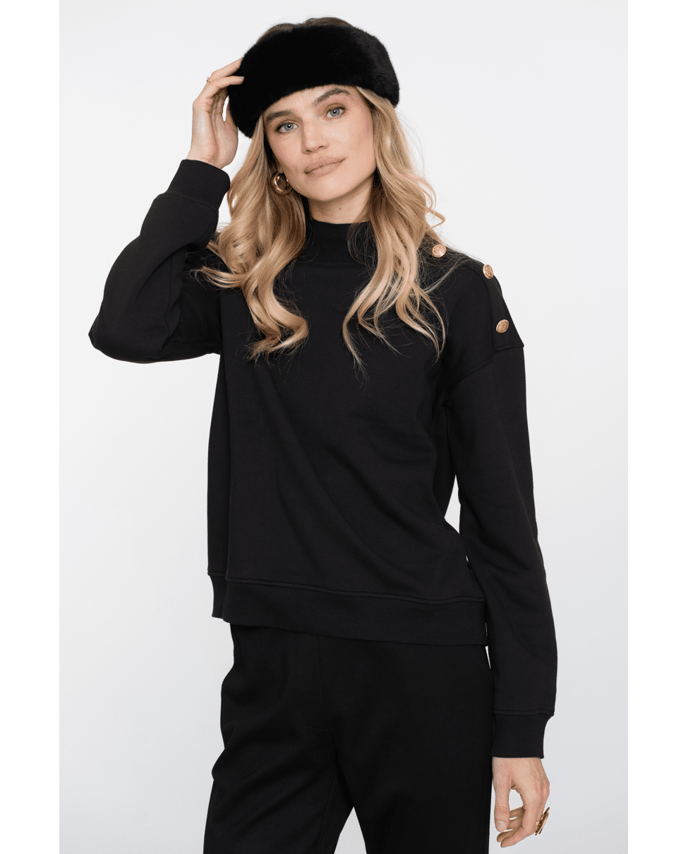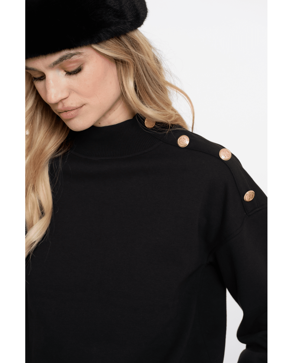 Een comfortabele sweater met goudkleurige knopen langs de schouderlijn. Het zachte katoenmix materiaal maakt hem ideaal voor dagelijks gebruik in de winter.