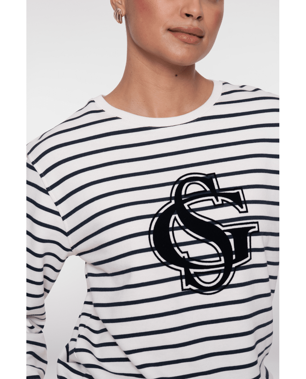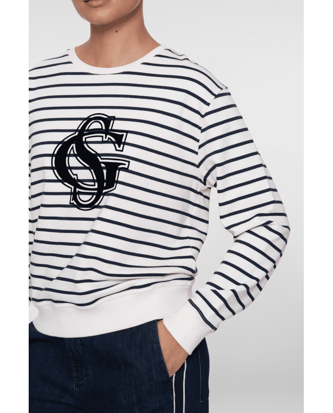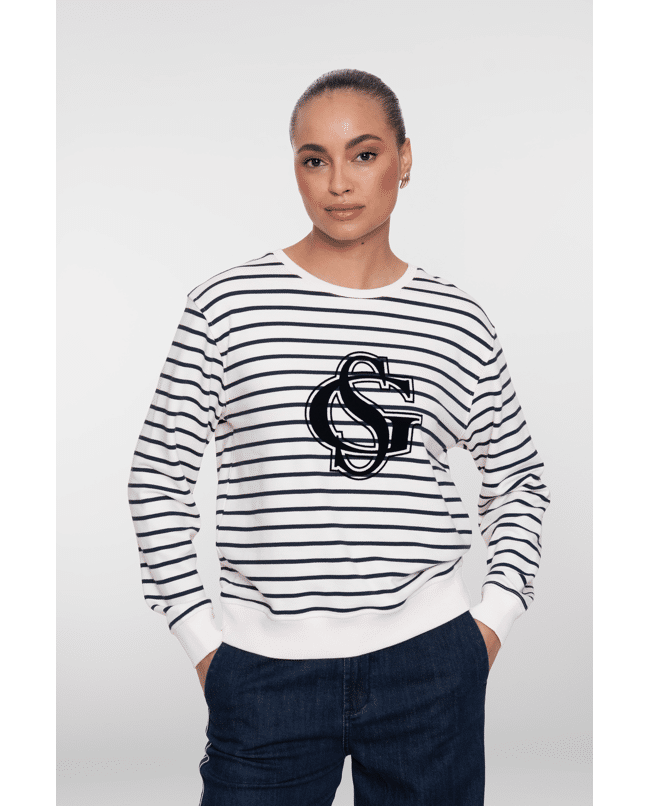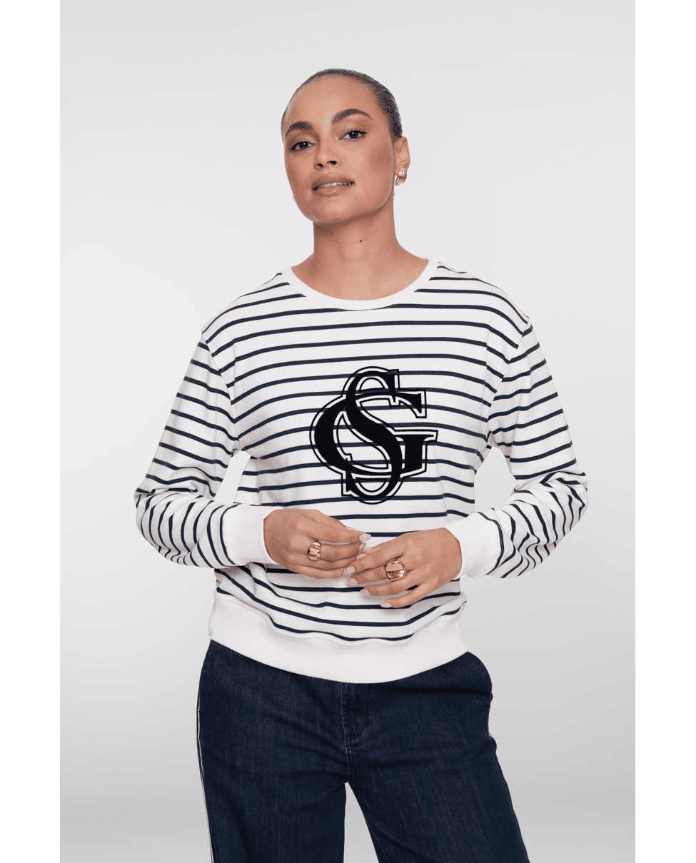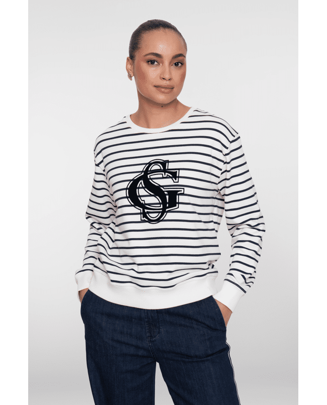 De mix van navy strepen en het GS-logo geeft deze sweater een moderne, preppy uitstraling – makkelijk te combineren met denim of een rok.