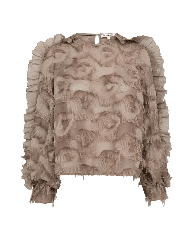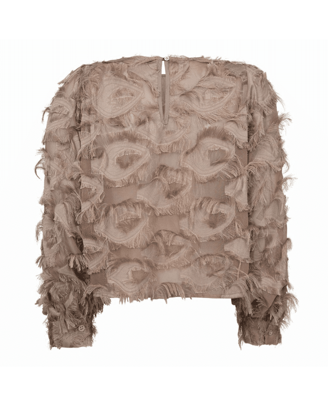 De SyraCC Structure blousetop in walnut is een echte blikvanger. De transparante stof met 3D-structuur en fringed details geeft deze top een luxe en speelse uitstraling.