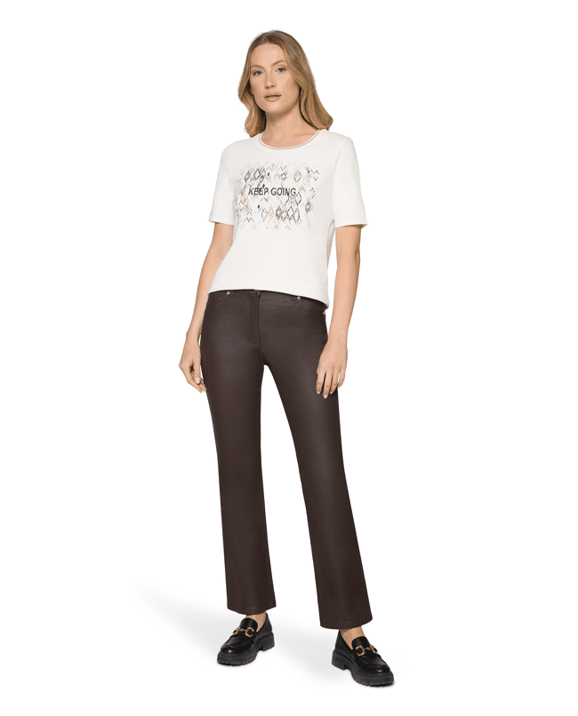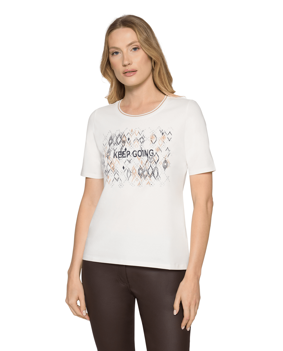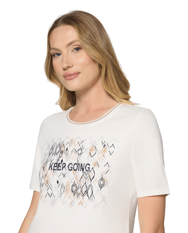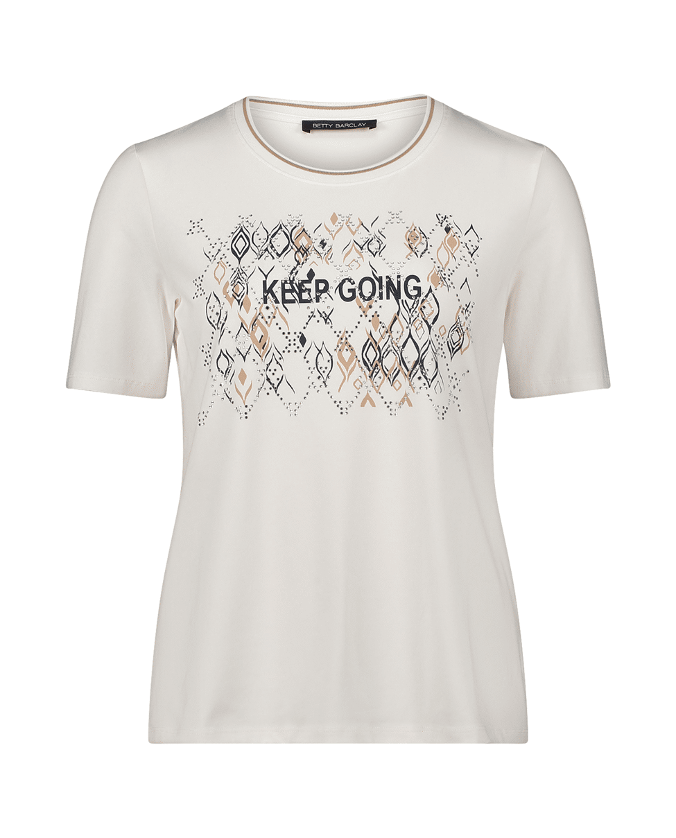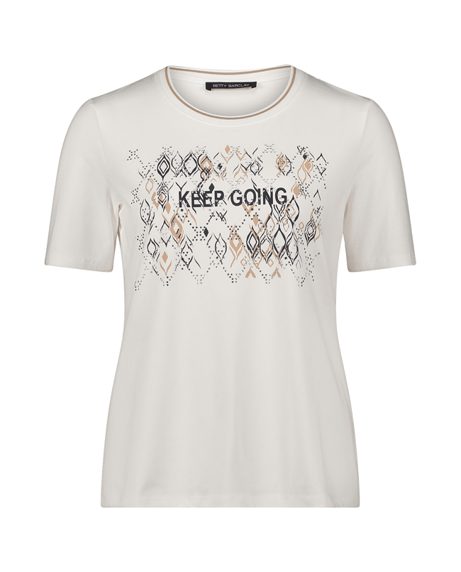 Dames T-shirt van Betty Barclay met print en tekst “KEEP GOING” versierd met strassteentjes, ronde hals met bies en korte mouwen