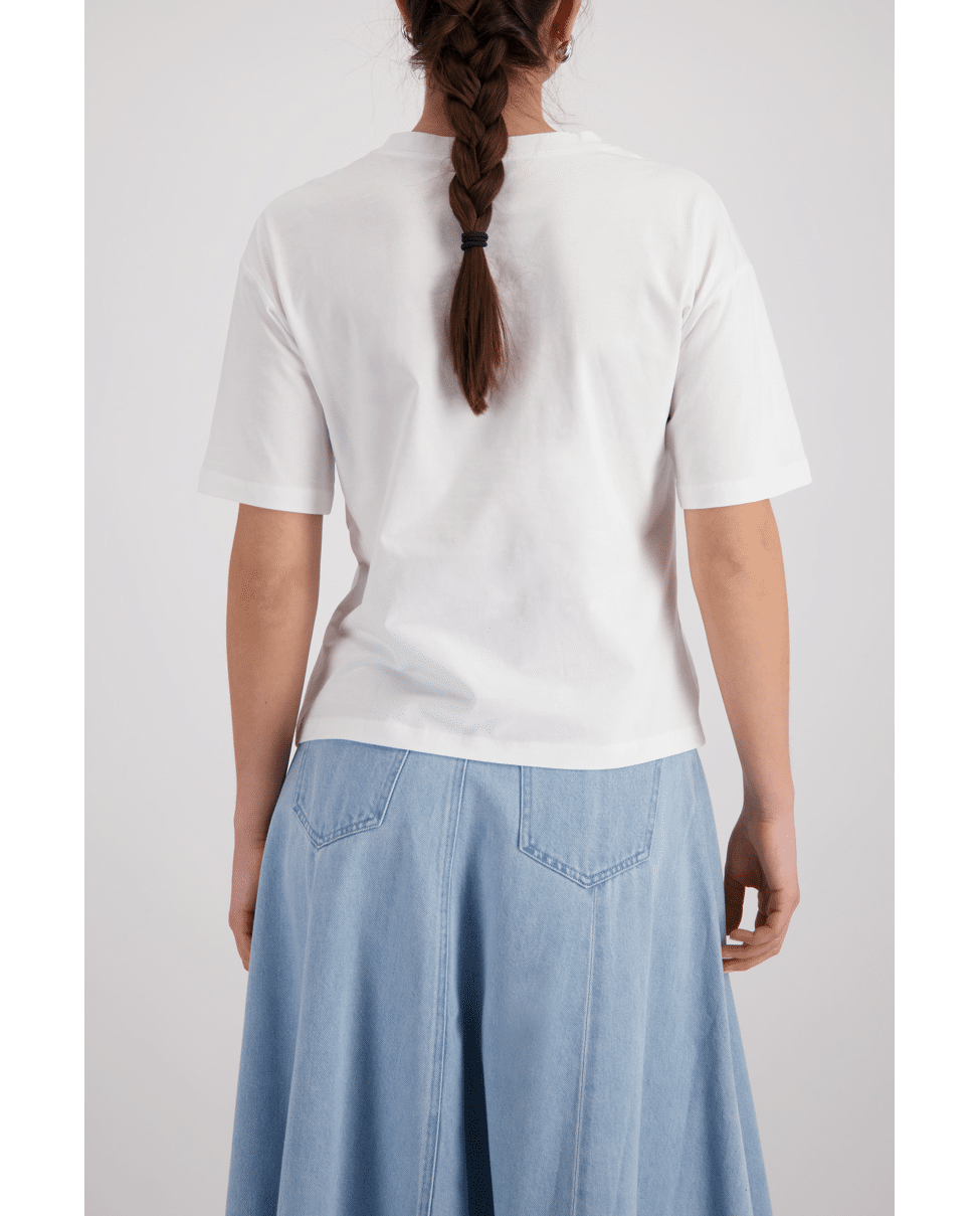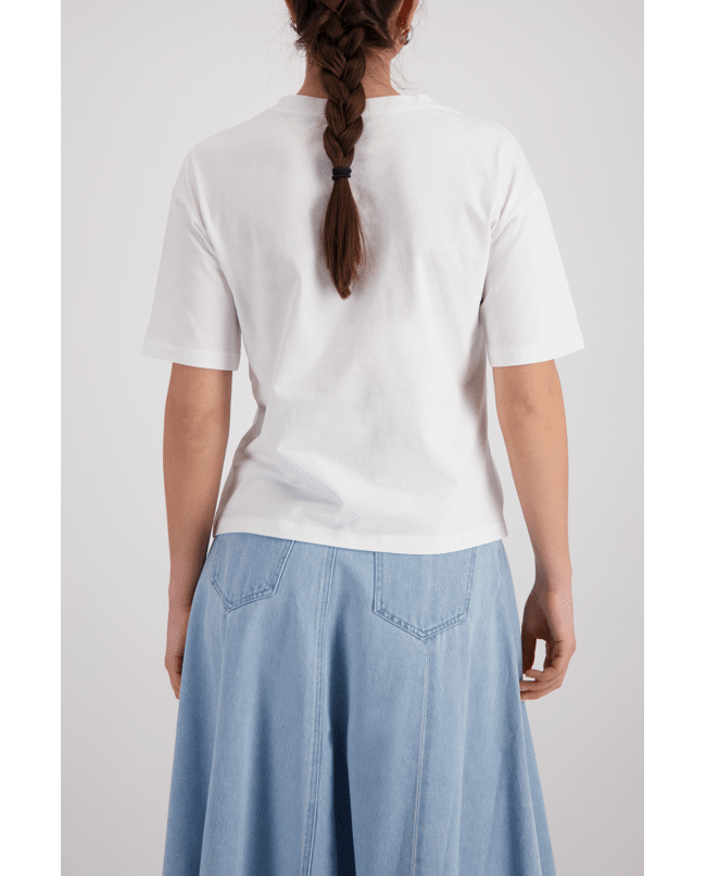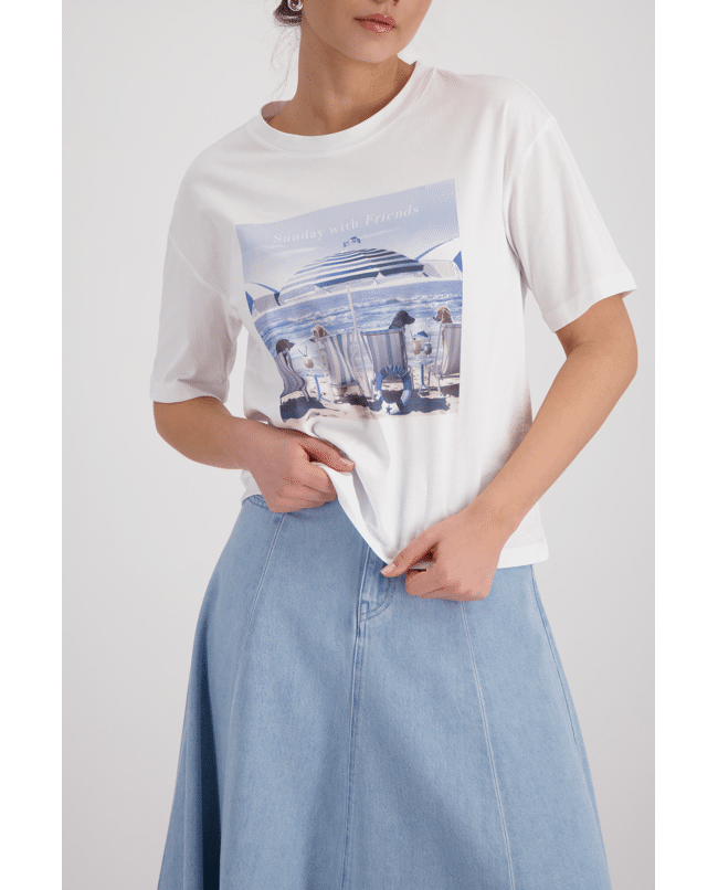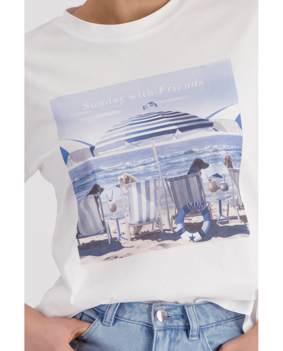 De strandprint met ‘Sunday with Friends’ brengt een ontspannen sfeer en maakt dit T-shirt net even speelser.