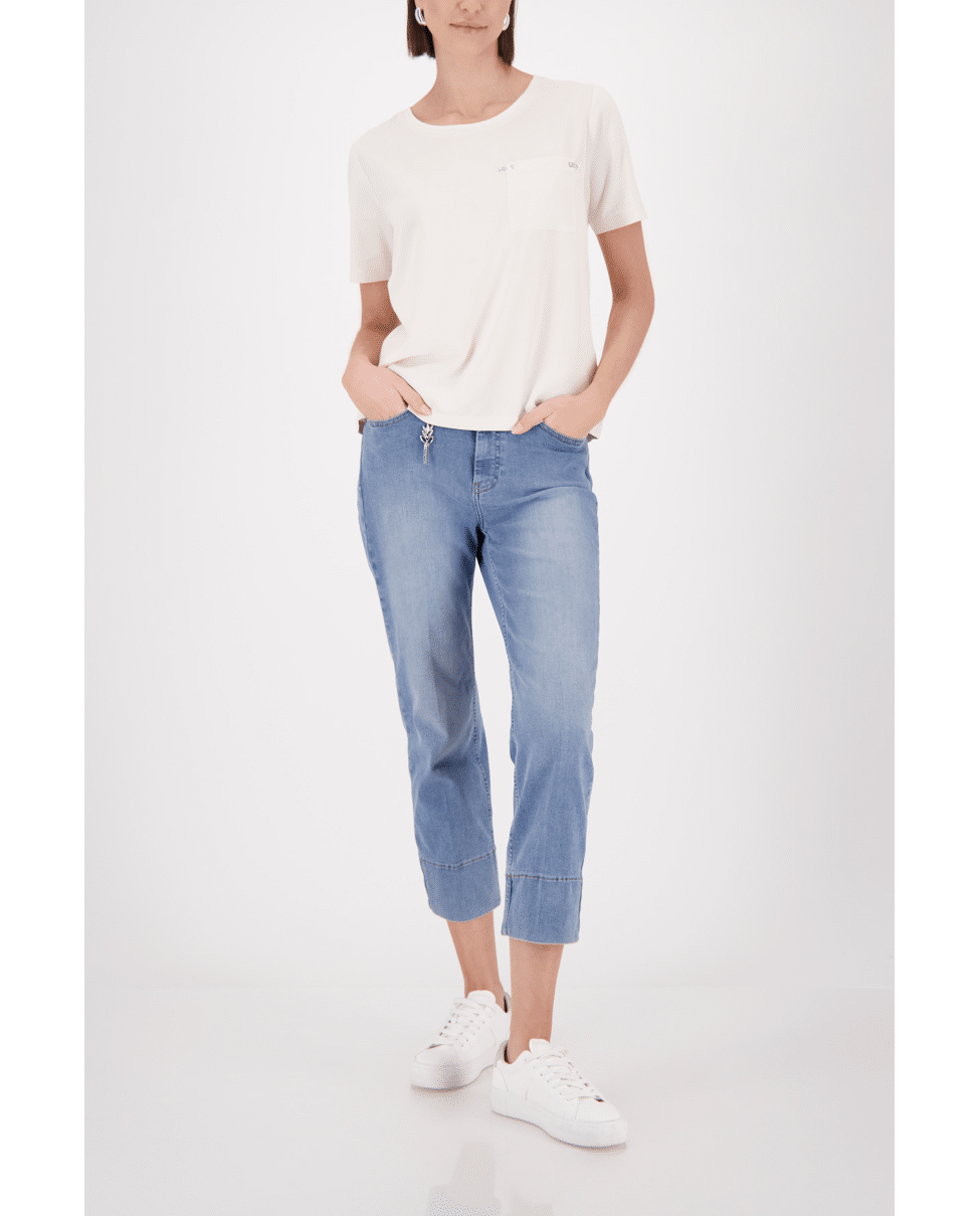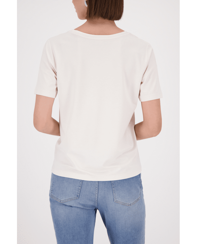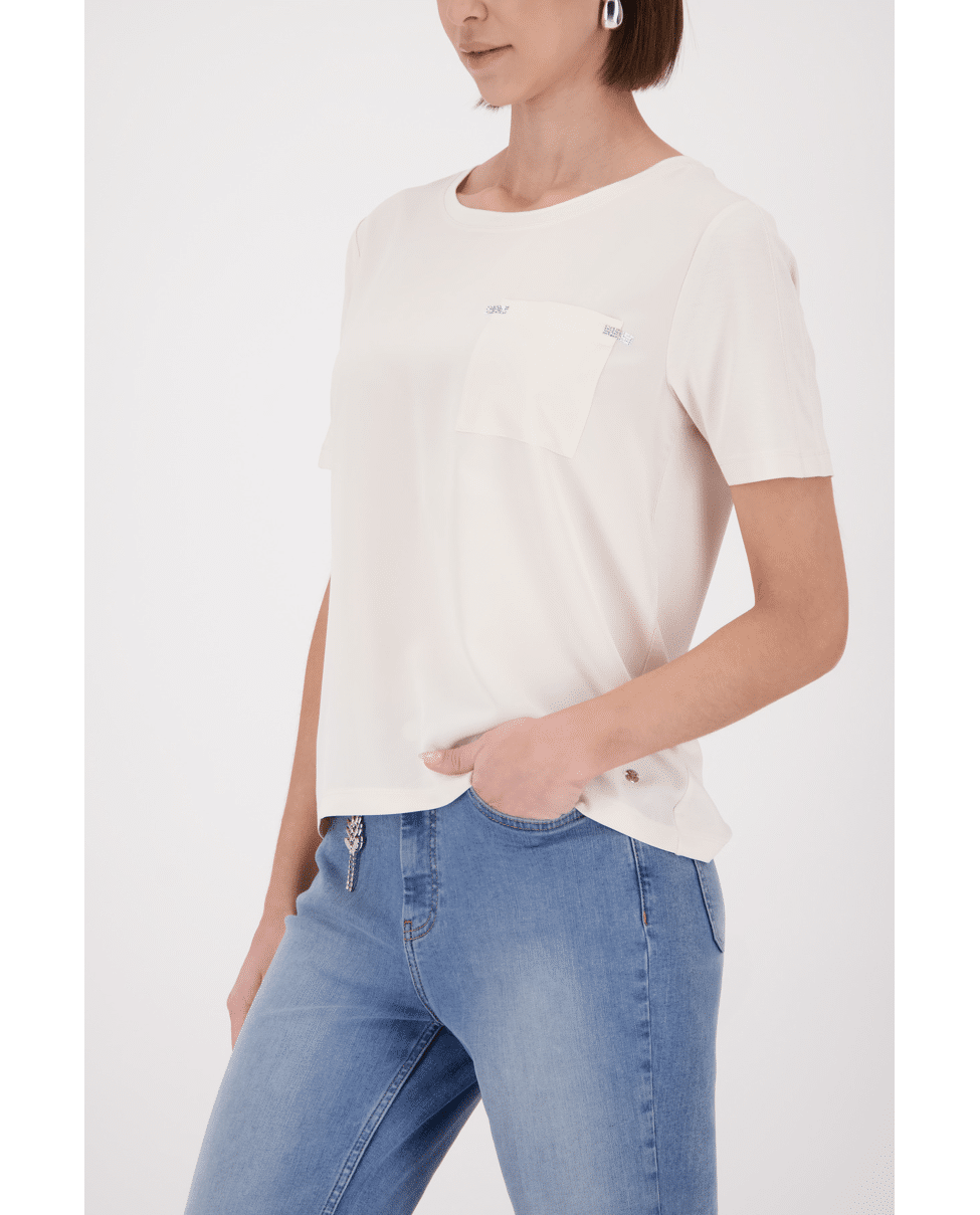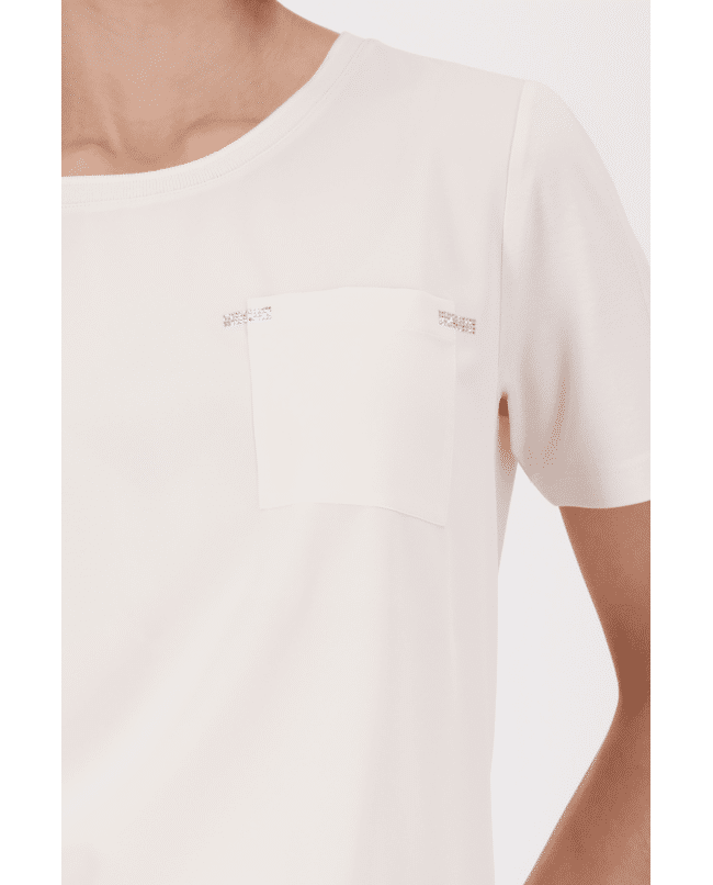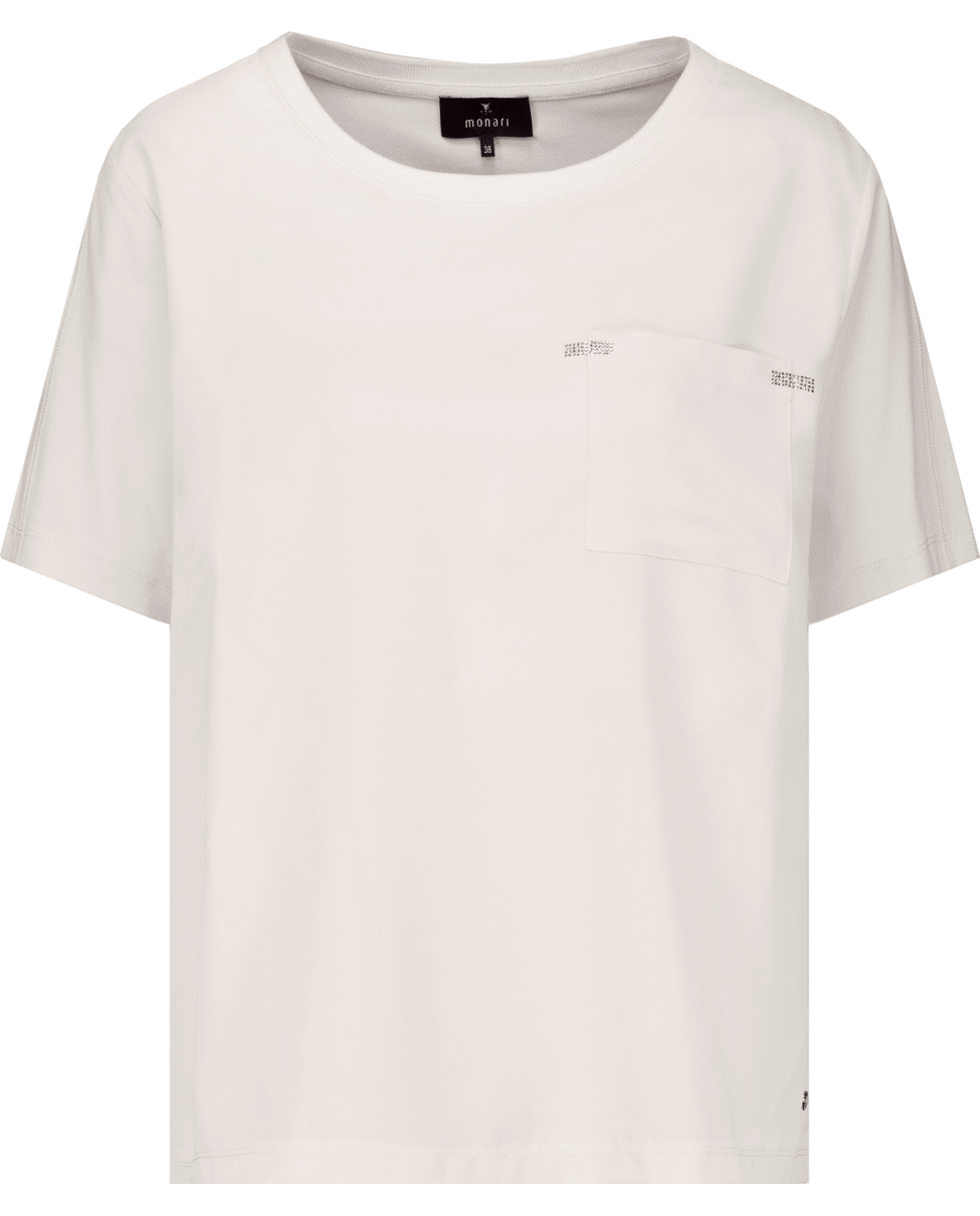 Dames T-shirt van Monari met borstzakje en subtiele strasdetails, korte mouw en ronde halslijn