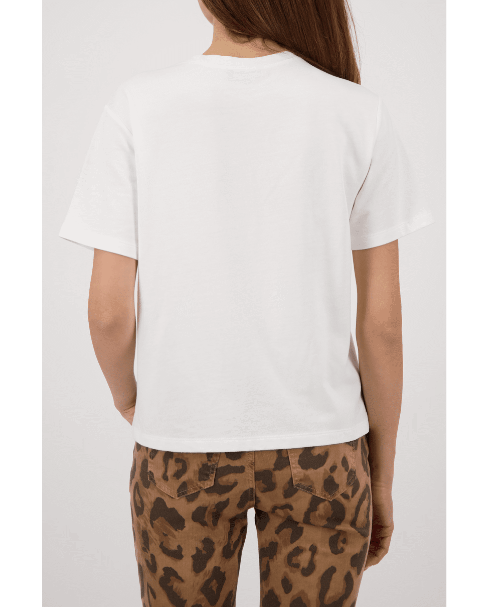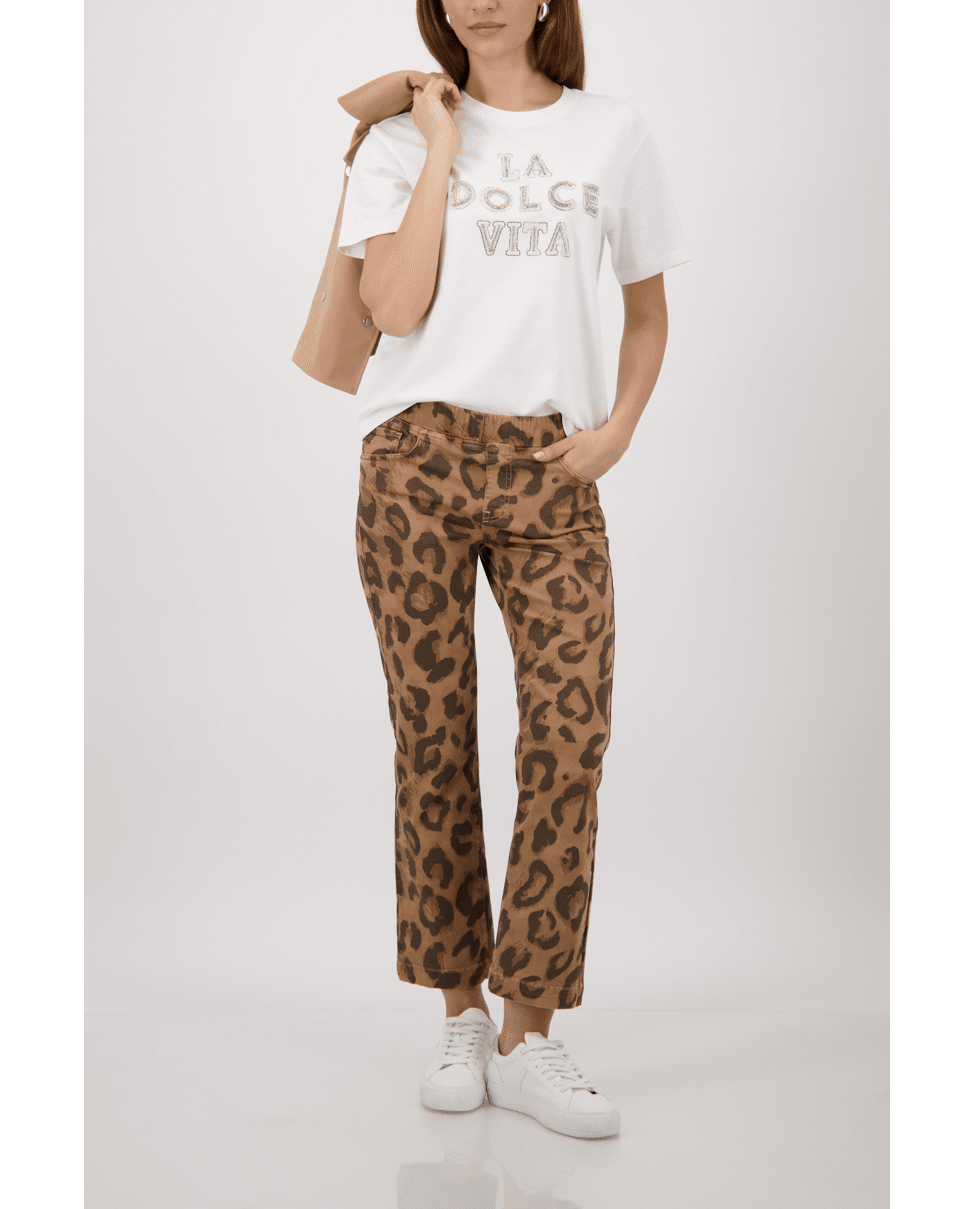 Dit witte T-shirt van Monari met “LA DOLCE VITA” in decoratieve letters geeft je outfit direct een stijlvolle twist. De ronde hals en korte mouwen zorgen voor een tijdloze, casual look. Perfect op een jeans, rok of onder een blazer.