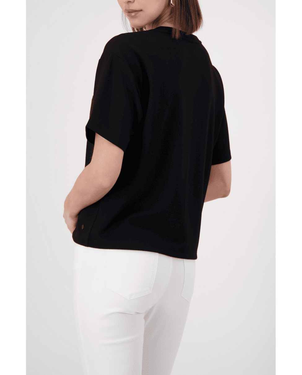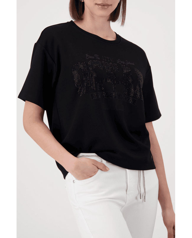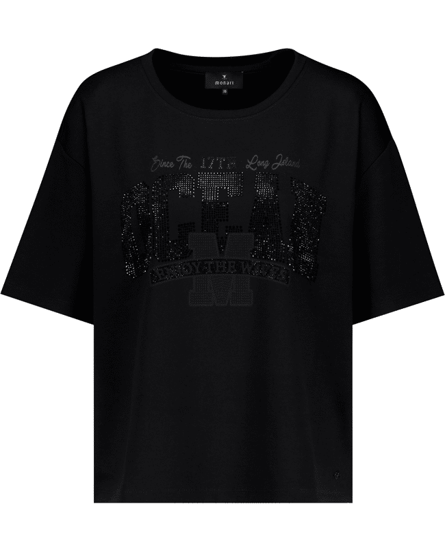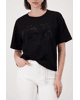 Dit zwarte T-shirt met sierlijk schrift geeft een casual look net dat beetje extra. Ideaal voor elke dag, maar ook makkelijk te stylen voor een meer geklede outfit.