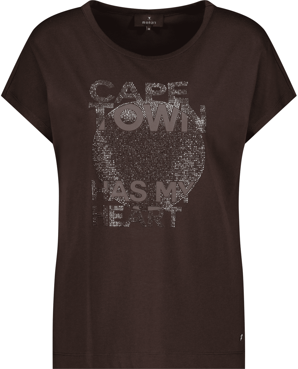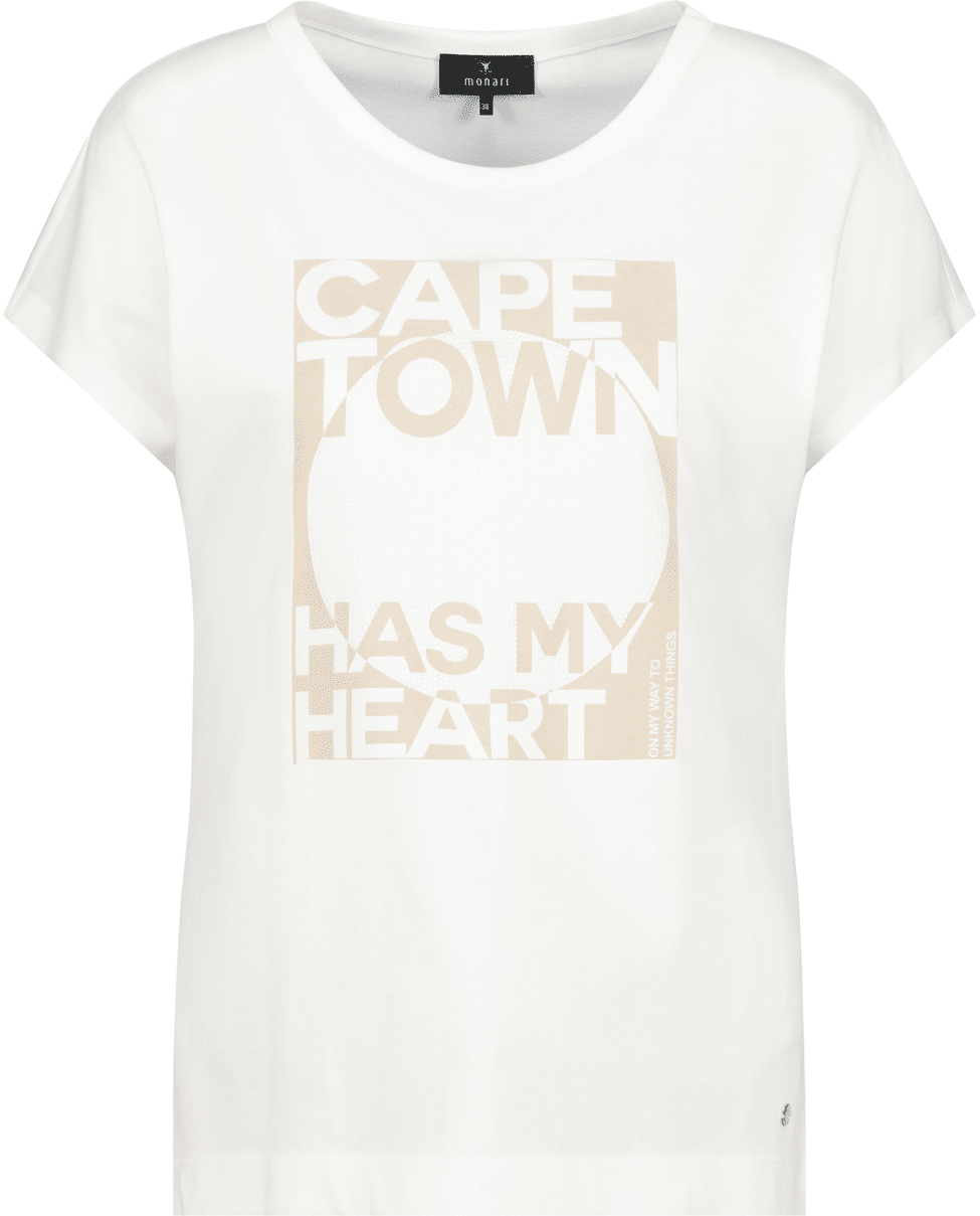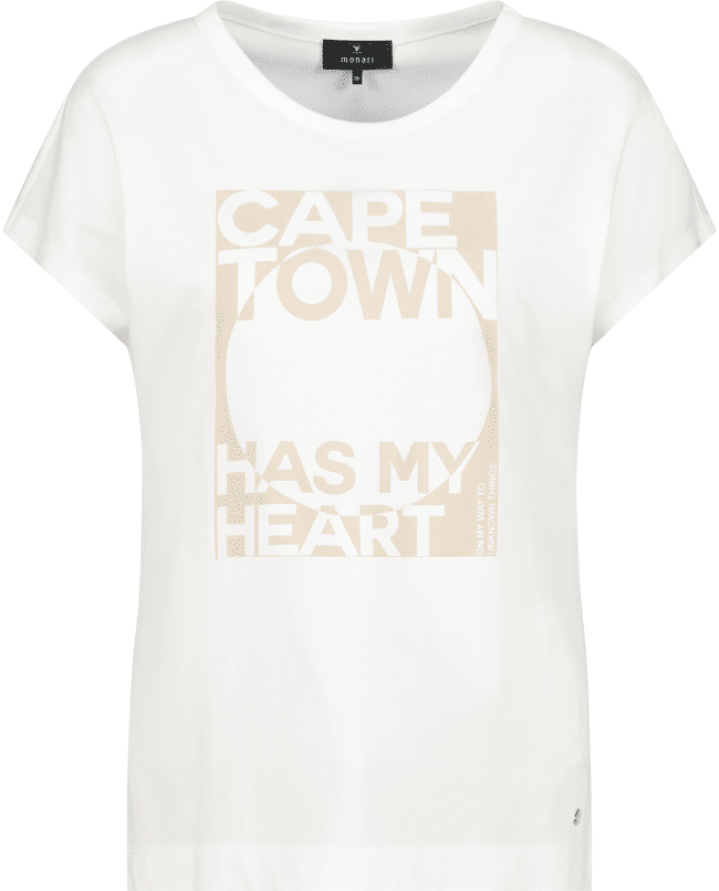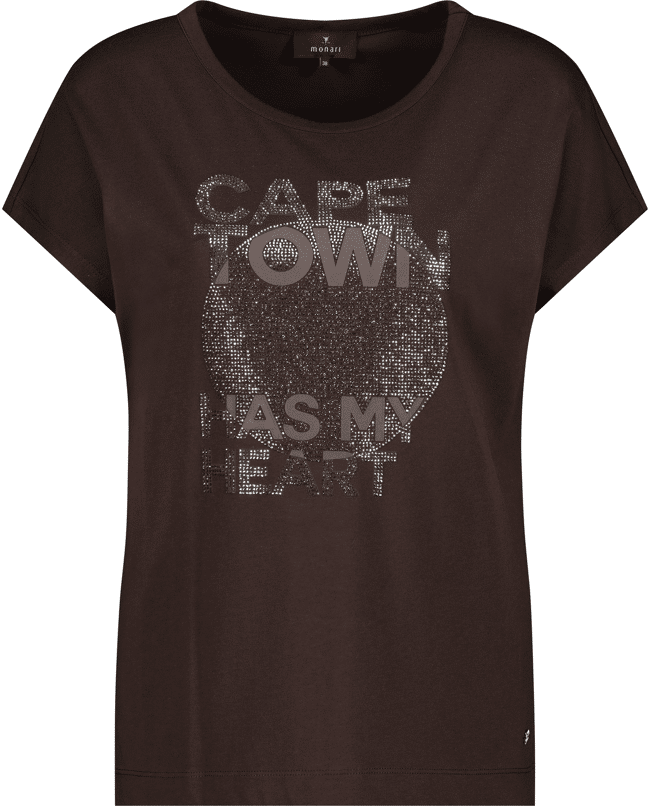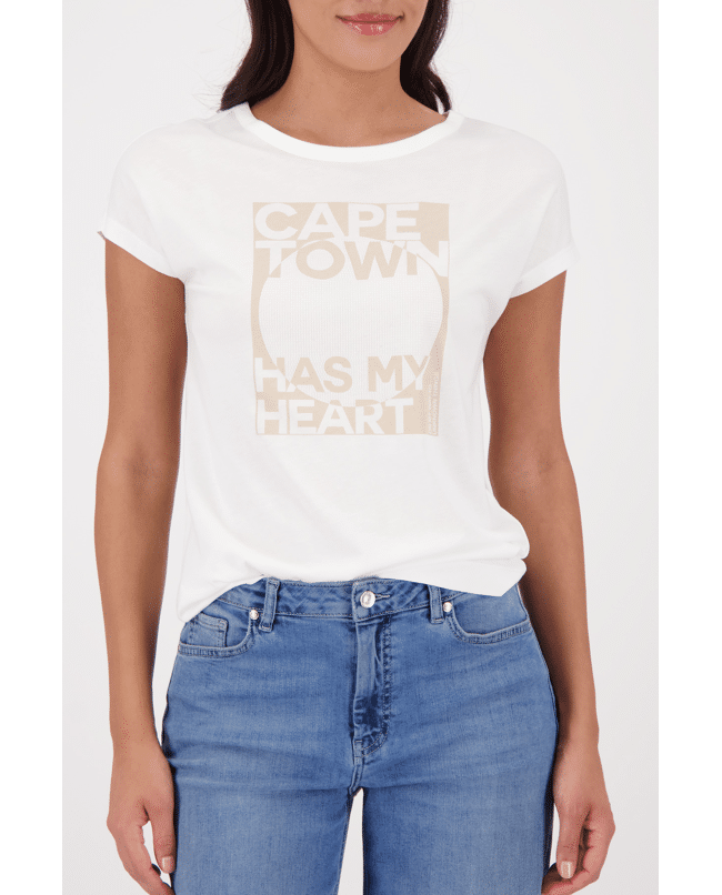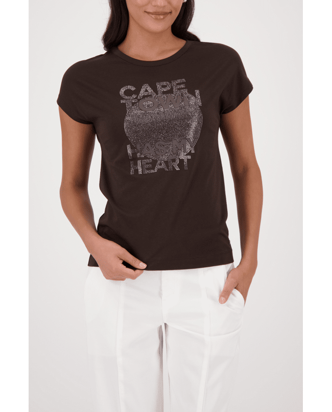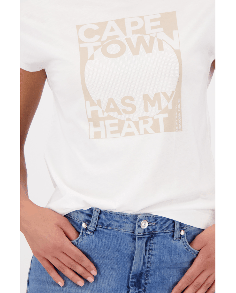 Dames T-shirt van Monari met print van glitters en tekst “Cape town has my heart”, ronde hals en korte mouwen