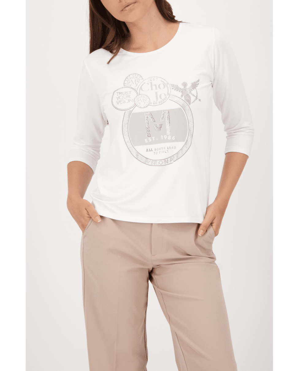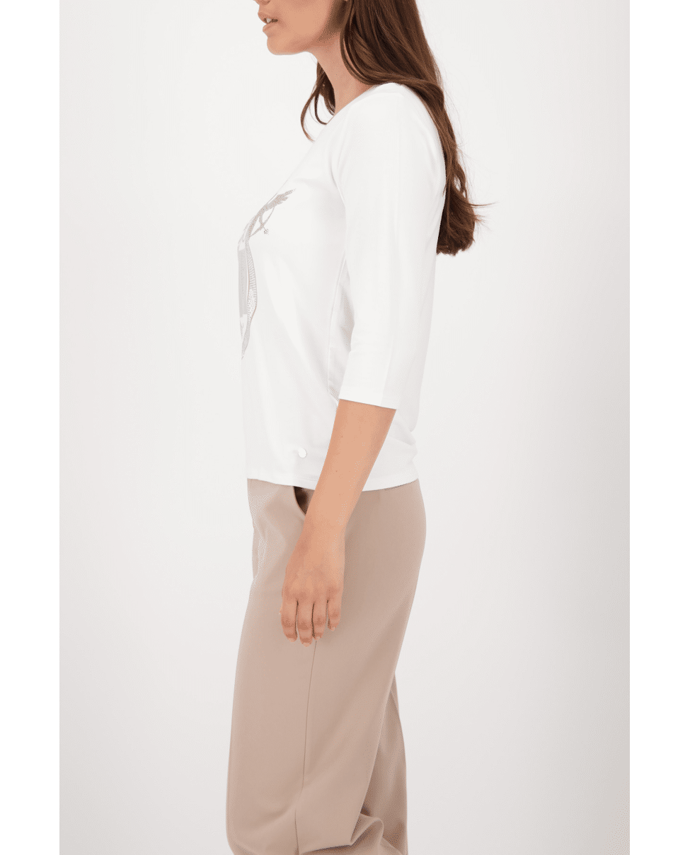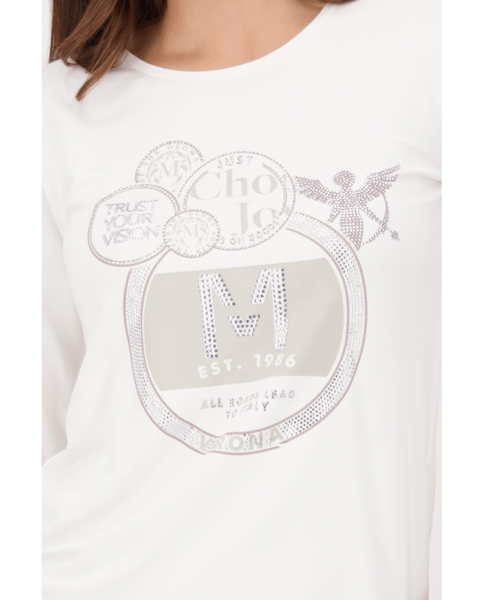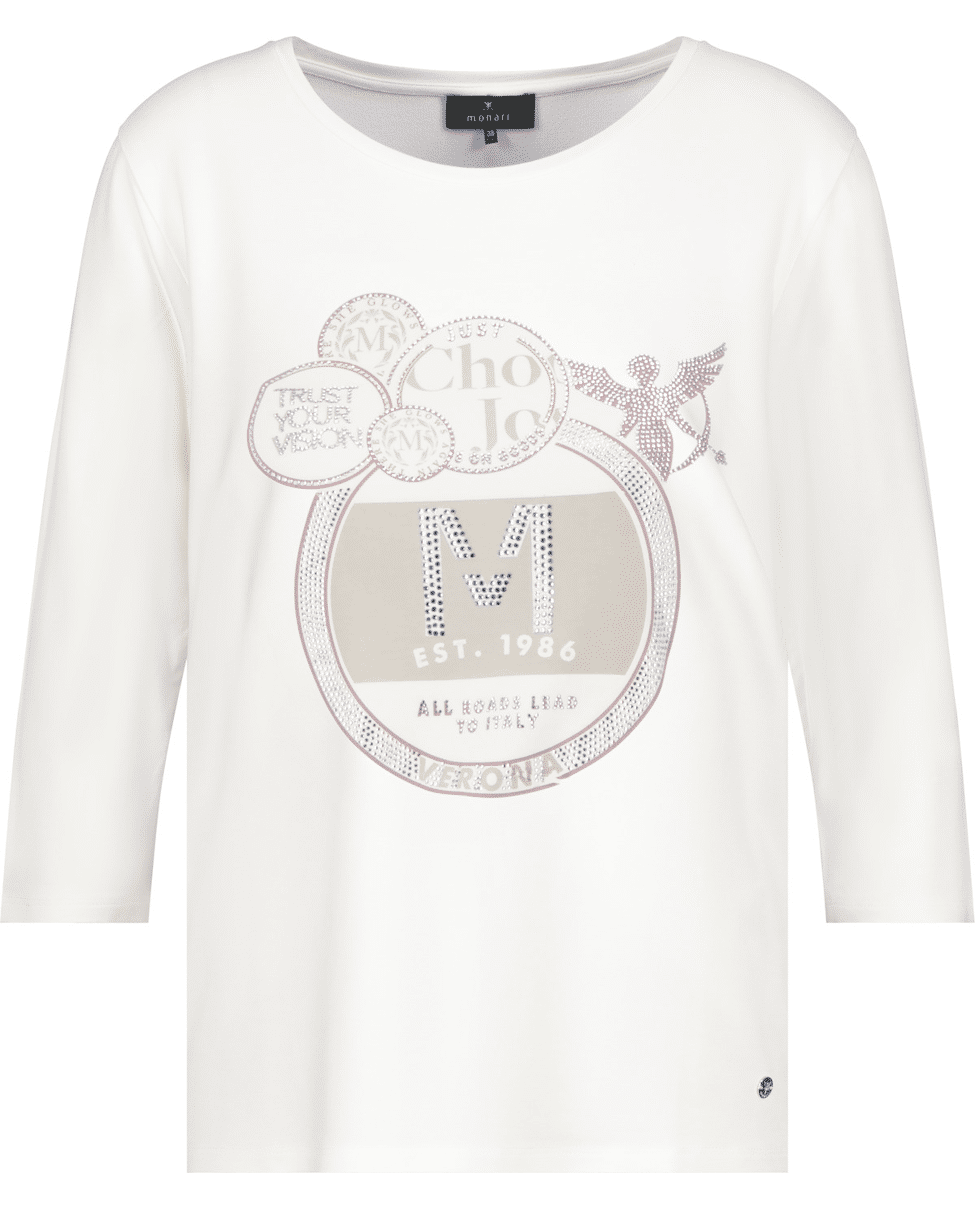 Het sierembleem met strassteentjes en illustraties maakt van dit basic shirt een speels modestatement.