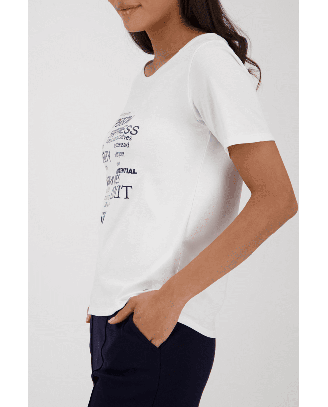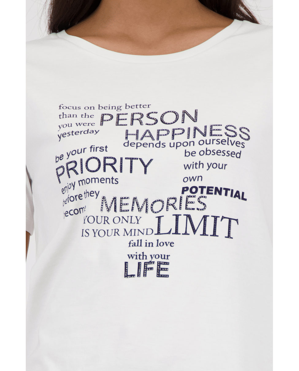 Een luchtig T-shirt met een inspirerende tekstprint en subtiele glansaccenten. Perfect voor casual dagen met een vleugje persoonlijkheid.