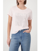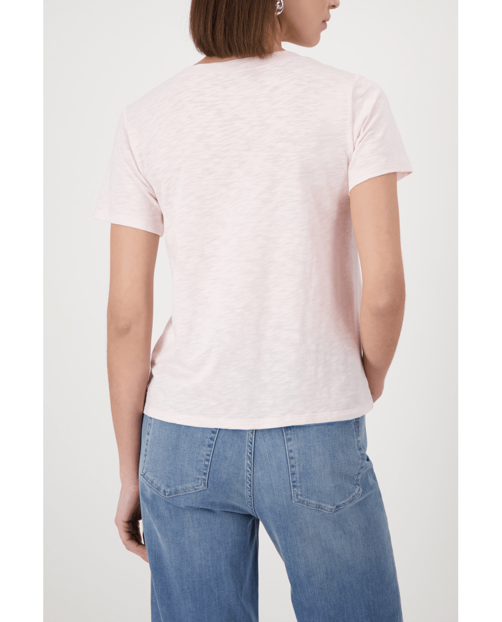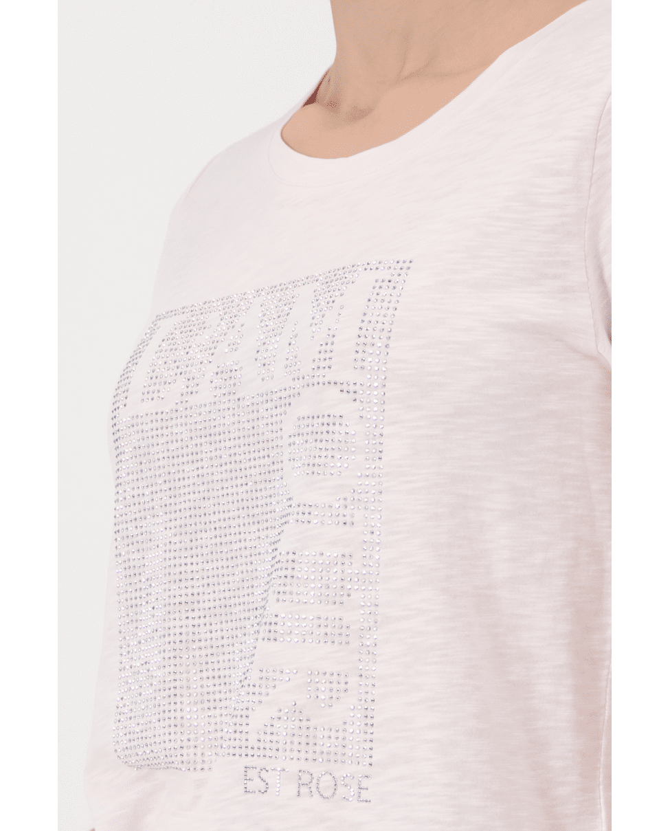 Dit dames T-shirt met strassprint geeft een zachte, vrouwelijke touch aan je outfit. De subtiele glans en rustige kleur maken het een makkelijk item voor elke dag.