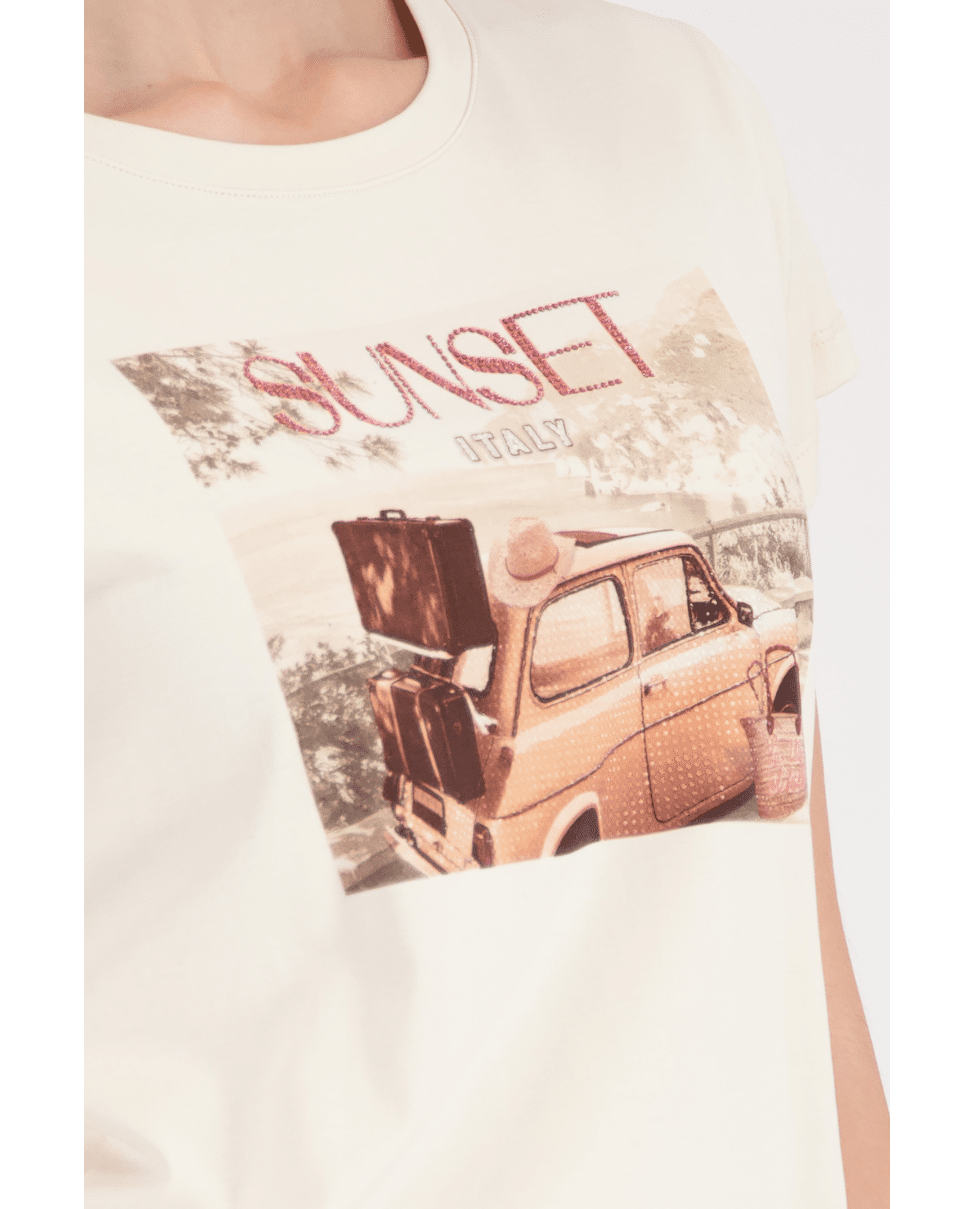 De warme tinten en vintage auto print zorgen voor een subtiel statement dat meteen sfeer toevoegt aan je look.