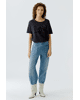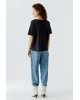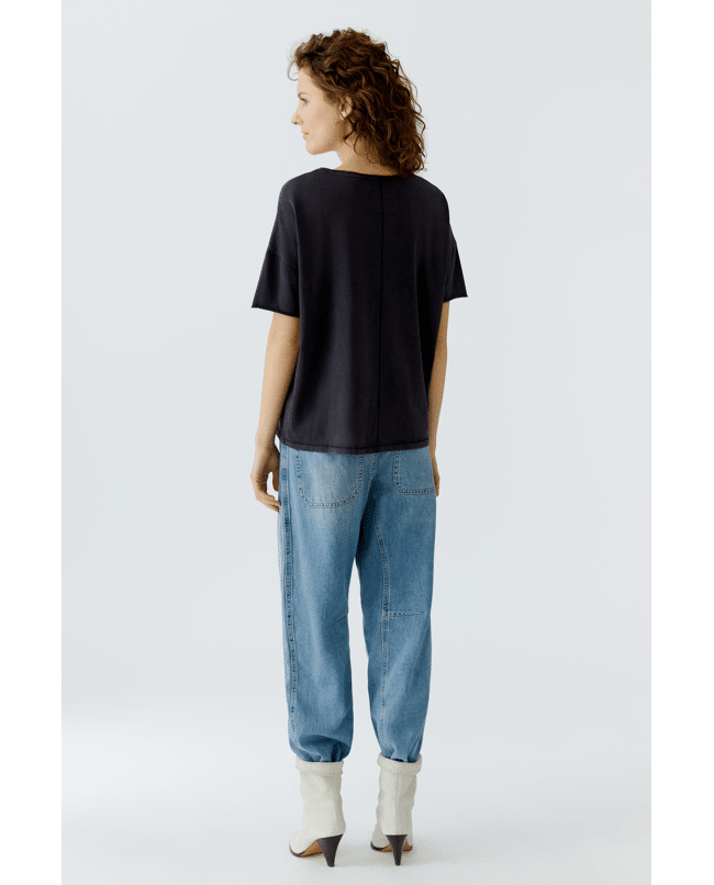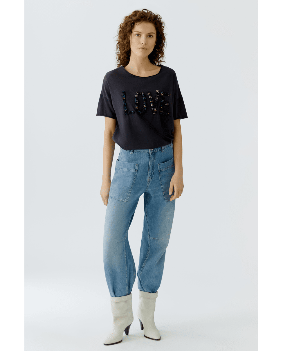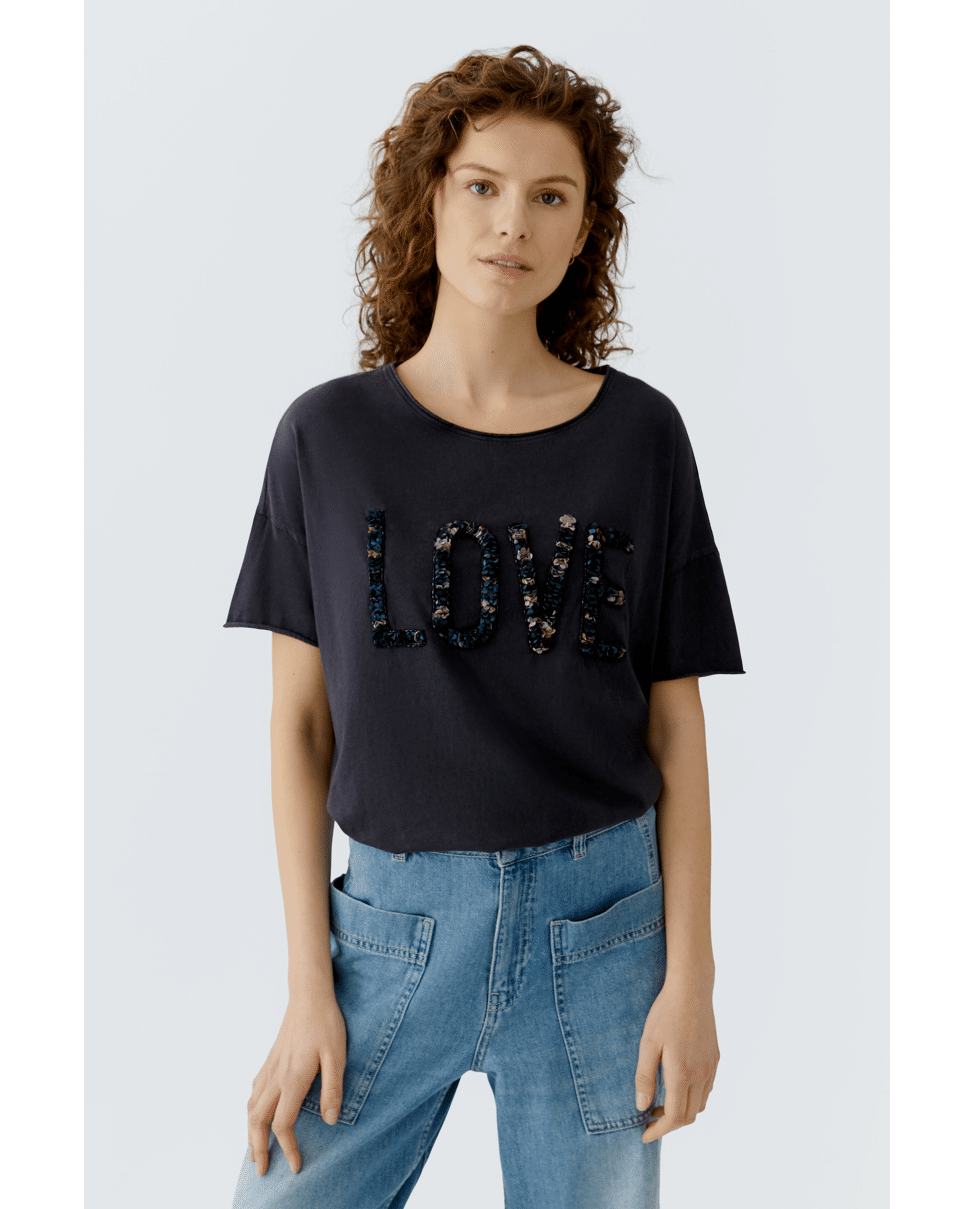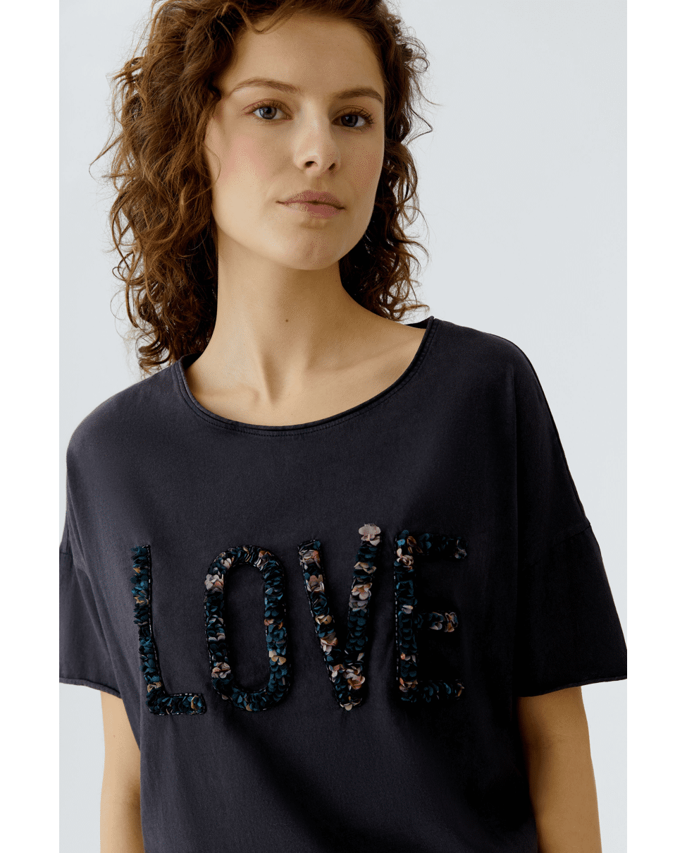 Dit loose fit T-shirt van Oui in washed black brengt een creatieve twist in je garderobe. De 3D “LOVE”-applicatie met bloemenprint voegt karakter toe aan een verder minimalistische look.