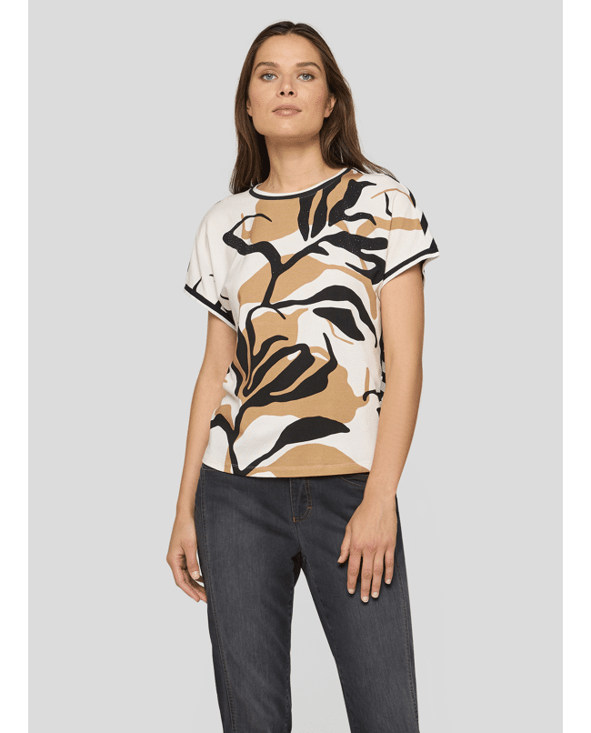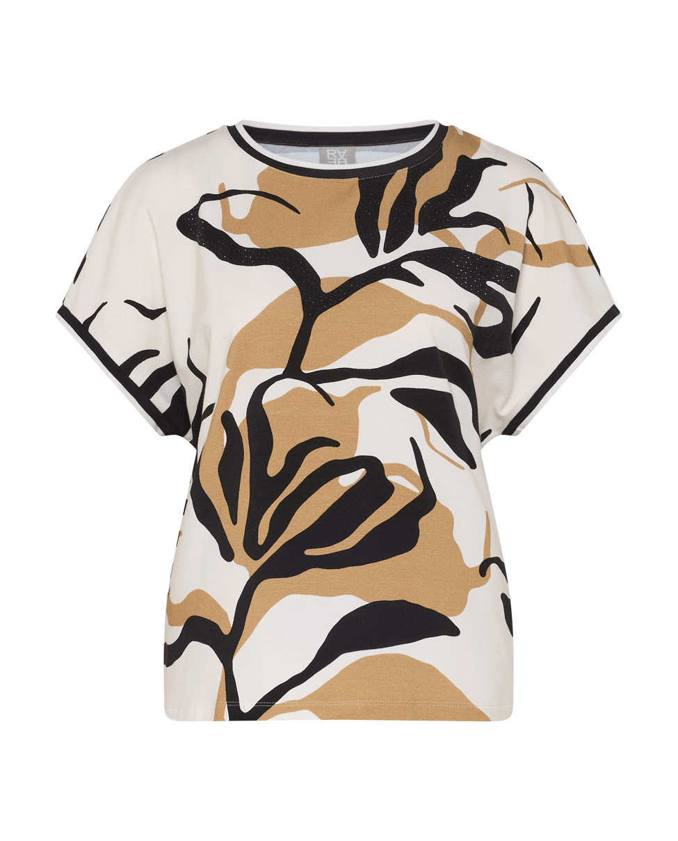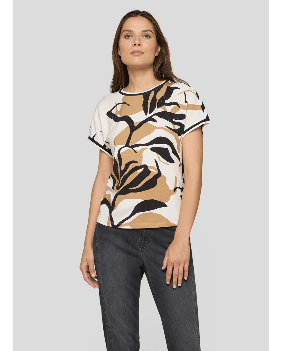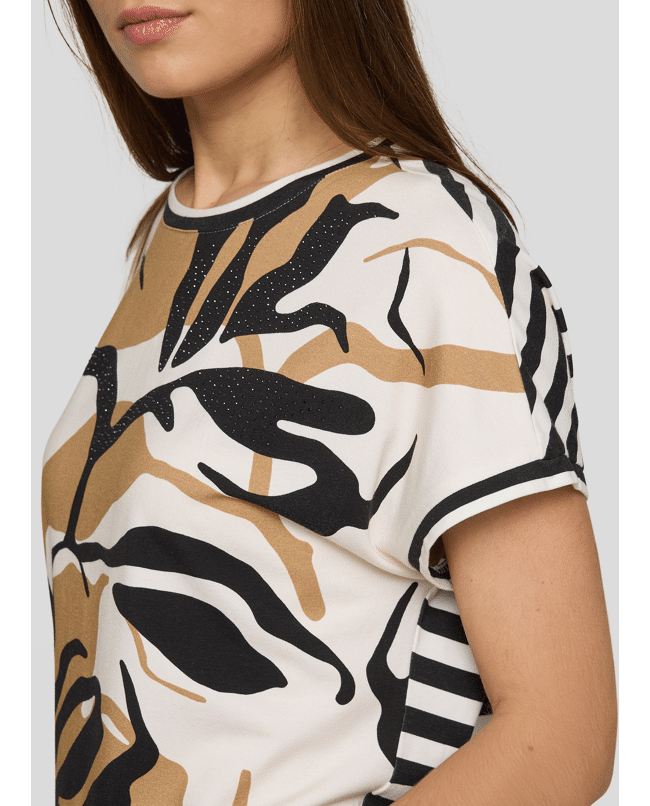 Dames T-shirt van Rabe met abstracte bladprint en siersteentjes, achterkant is gestreept, ronde hals en korte mouwen
