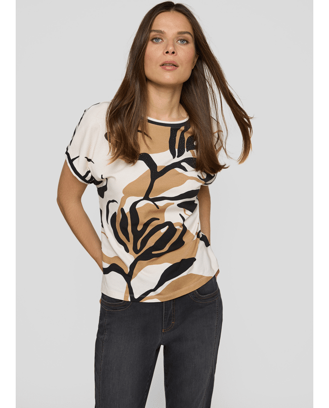 Een opvallend T-shirt met abstracte bladprint voor een frisse, zomerse uitstraling. Ideaal voor een dag in de stad of een relaxte lunch op het terras. Gemaakt voor vrouwen die comfort én stijl waarderen.