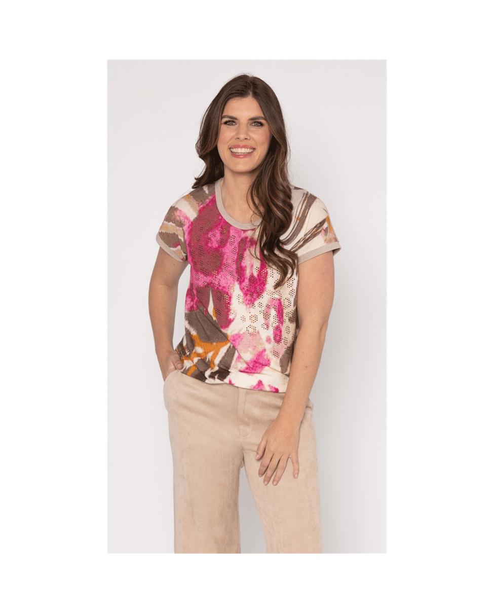 Deze dames blouson met ronde hals en Scarlet Safari artwork is een echte eyecatcher. De combinatie van warme rood- en bruintinten met het geplaatste frontdesign geeft dit T-shirt een krachtige, zomerse uitstraling.