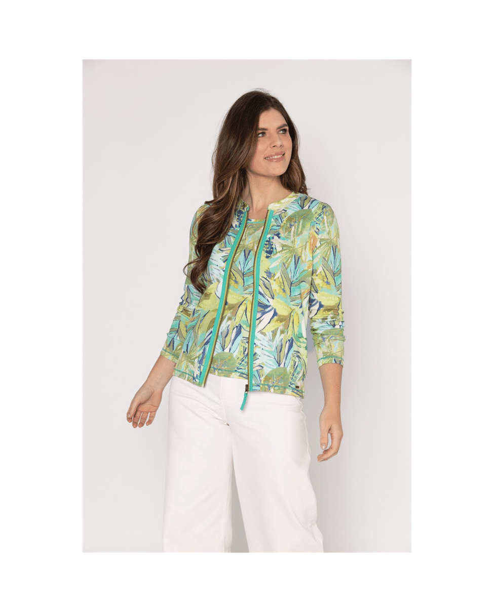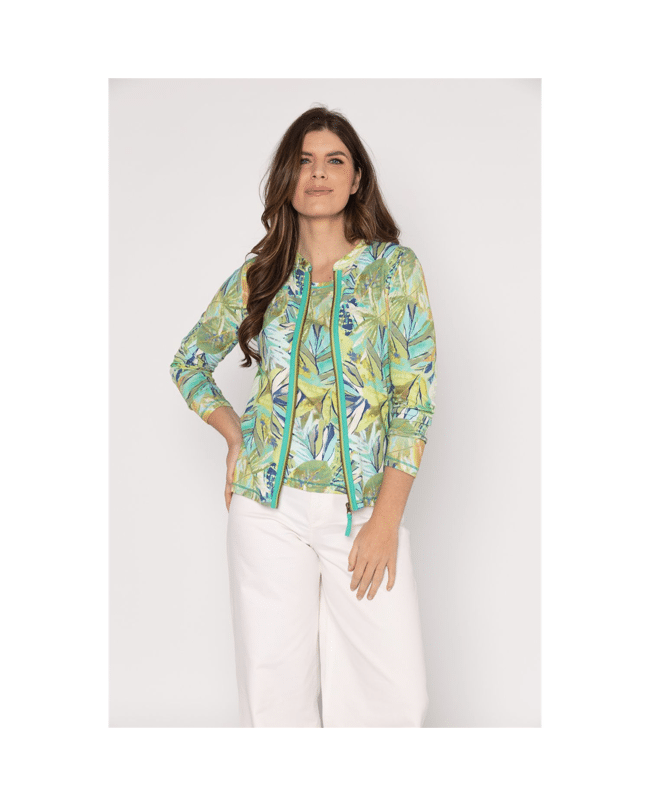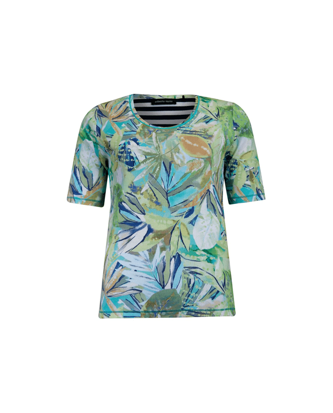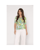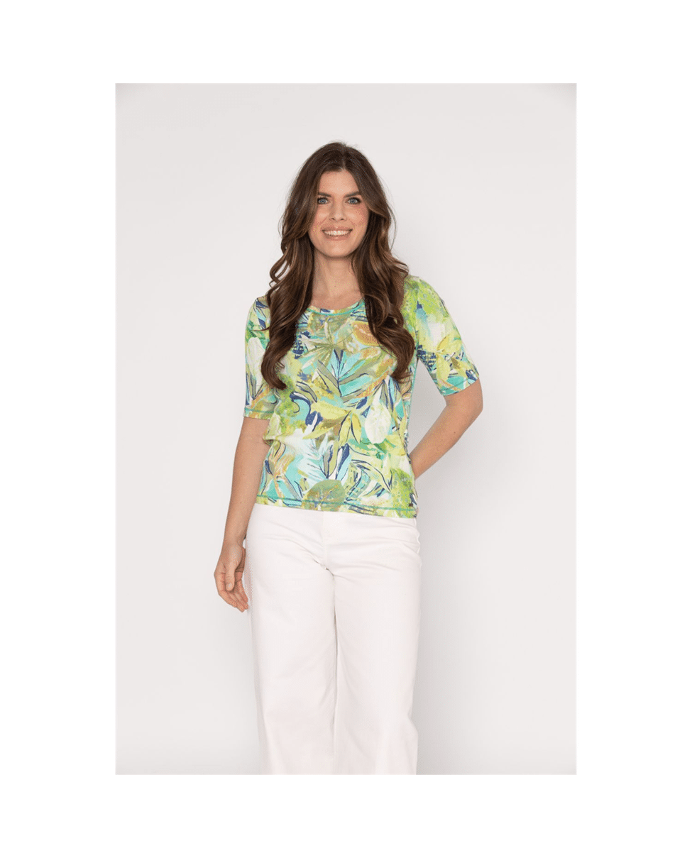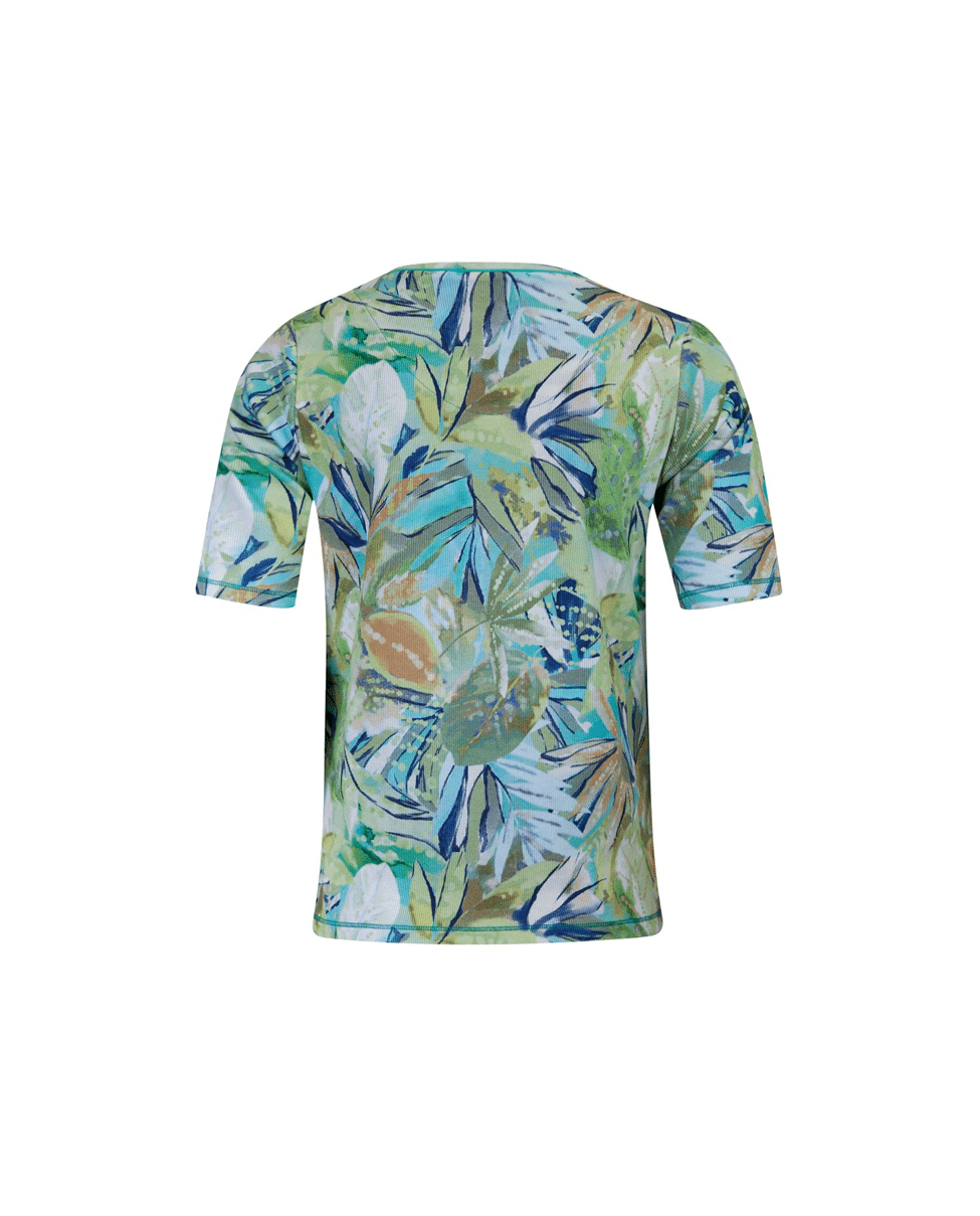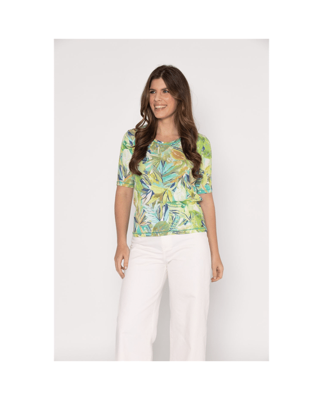 Dit multicolor dames T-shirt met tropische bladerenprint is een frisse must-have voor het voorjaar. De combinatie van Agua Green en Backyard Leaves geeft je outfit direct een zomerse uitstraling. Perfect op een lichte broek of casual denim.